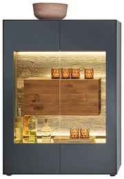 Die Valnatura Wandkombination LIVINO vereint erstklassiges Design mit hochwertiger Verarbeitung. Gefertigt aus massivem Echtholz in Kerneiche Umato und ergänzt durch anthrazit lackierte Lackelemente aus Birke, strahlt diese Wohnwand natürliche Eleganz aus. Das Sicherheitsglas und die grifflosen Türen sorgen für ein modernes und minimalistisches Erscheinungsbild. Dank der Push-to-open-Funktion lassen sich die Türen mühelos öffnen und schließen. Die Kombination aus Highboard, Hängeboard und Wandpaneel mit Beleuchtung schafft ein harmonisches Gesamtbild und setzt stilvolle Akzente in Ihrem Wohnraum.