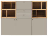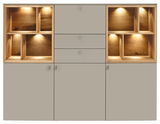 Das Venjakob Highboard ANDIAMO 3.0 vereint modernes Design mit durchdachter Funktionalität. Das elegante Möbelstück ist in einem stilvollen Steingrau gehalten und wird durch die warme Eiche-Optik akzentuiert. Mit drei Drehtüren und zwei Schubladen bietet es ausreichend Stauraum für verschiedenste Gegenstände. Die Kombination aus Holz und hochwertigen Griffen verleiht dem Highboard eine zeitlose Ästhetik, die in jedem Raum zum Blickfang wird. Die integrierte LED-Beleuchtung sorgt für ein einladendes Ambiente und setzt Ihre Lieblingsstücke perfekt in Szene. Erleben Sie die perfekte Symbiose aus Design und Funktionalität.