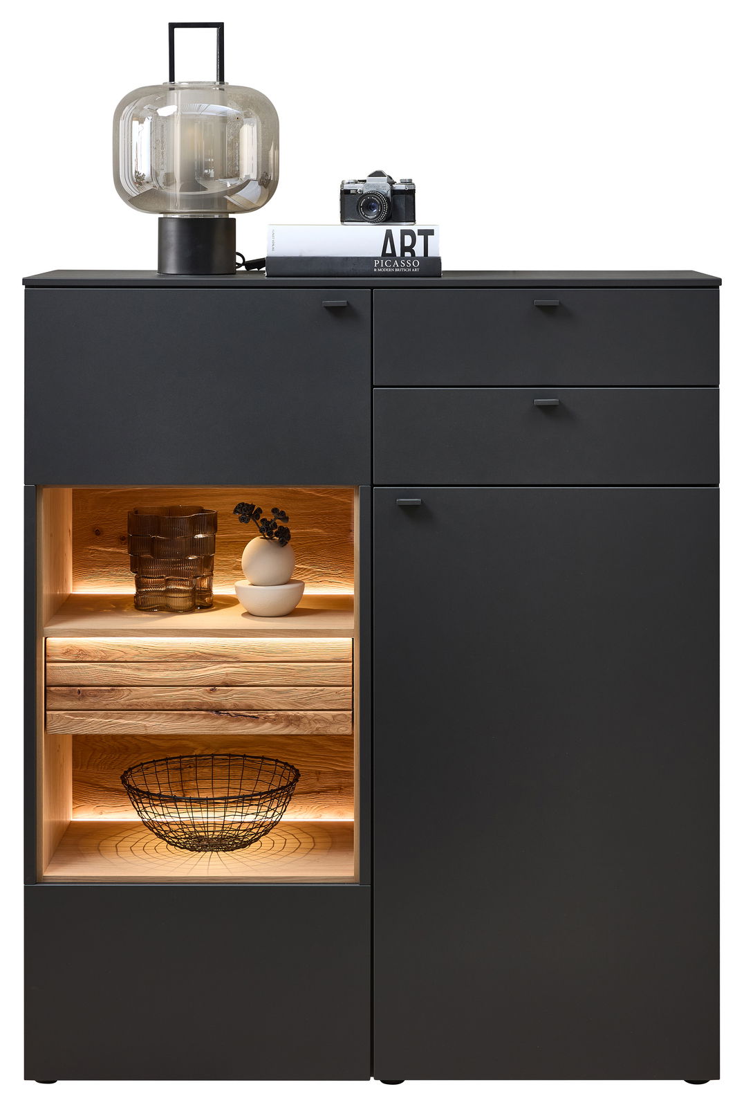 Das Venjakob Highboard LUMEA ist ein Highlight für jeden Wohnraum. Mit seinem modernen und trendigen Design passt es perfekt in jedes zeitgemäße Interieur. Es präsentiert sich in einer edlen anthrazitfarbenen Lackierung, sowohl am Korpus als auch an der Front. Ein besonderer Akzent wird durch die Eiche groove gehackt geölt und gebürstet, massiv gesetzt. Das Highboard LUMEA bietet mit einer Höhe von 140 cm, einer Breite von 120 cm und einer Tiefe von 43 cm viel Stauraum.