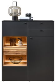 Praktisches Highboard LUMEA mit cleveren DetailsDas Highboard LUMEA verfügt über eine Glas-/Holztür links und eine Holztür, die beide mit einem praktischen Push-to-Open-System ausgestattet sind. Zudem gibt es eine Schublade mit Vollauszug, die zusätzlichen Stauraum bietet. Ein besonderes Highlight ist die integrierte LED-Beleuchtung inklusive Trafo, die für eine stimmungsvolle Atmosphäre sorgt. Das Hauptmaterial des Highboards ist ein hochwertiges Holzfurnier. Ganz gleich, ob Sie Bücher, Geschirr oder Dekoartikel verstauen möchten, das Venjakob Highboard LUMEA ist die ideale Wahl. Bringen Sie mehr Ordnung und Stil in Ihr Zuhause - entscheiden Sie sich jetzt für das Highboard LUMEA!