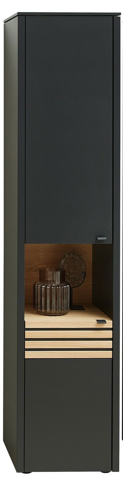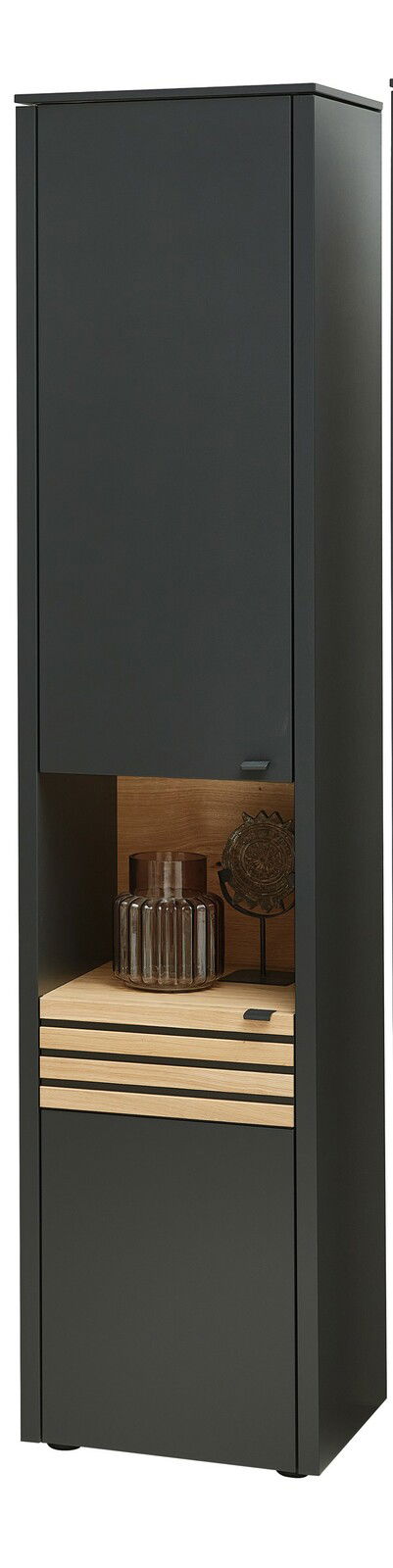 Die Vitrine "Venjakob GAME" vereint modernes Design mit hochwertiger Verarbeitung und bietet eine stilvolle Präsentationsfläche für Ihre Lieblingsstücke. Mit einer Höhe von 208 cm, einer Breite von 47 cm und einer Tiefe von 43 cm passt dieses Möbelstück perfekt in diverse Wohnbereiche. Der Korpus und die Front in anthrazit-mattem Lack harmonieren exzellent mit den feinen Akzenten der Eiche furnierten Lamellen, die den modernen Look unterstreichen. Dieses elegante Stück ist mit zwei Drehtüren ausgestattet, hinter denen genügend Stauraum für Dekorationsgegenstände oder Sammlerstücke zur Verfügung steht.