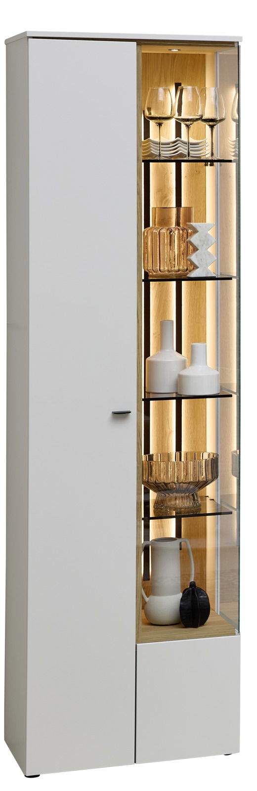 Die Venjakob Vitrine VANYA besticht durch ihr modernes Design und ihre hochwertige Verarbeitung. Mit einer Kombination aus Sicherheitsglas und Wildeiche-Holzfurnier setzt sie in jedem Raum einen stilvollen Akzent. Die Vitrine ist komplett in Weiß gehalten, wobei die Griffe in einem eleganten Anthrazit matt abgesetzt sind. Die Drehtür aus ESG optiwhite Glas und Lack bietet nicht nur eine klare Sicht auf Ihre liebsten Dekorationsstücke, sondern sorgt auch für eine sichere Aufbewahrung. Die integrierte LED-Beleuchtung setzt Ihre Objekte perfekt in Szene und schafft eine einladende Atmosphäre.