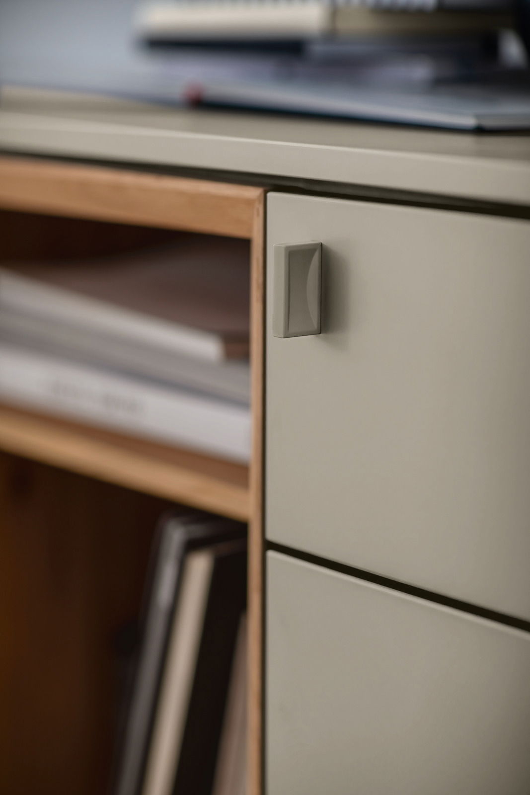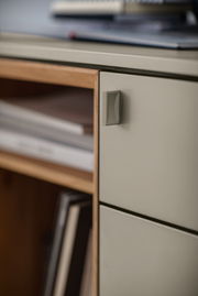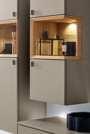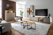 Entdecken Sie die stilvolle Venjakob Wandkombination ANDIAMO 3.0, die modernes Design und Funktionalität vereint. Diese Kombination besticht durch ihre elegante steingraue Farbgebung, die sowohl in der Front als auch im Korpus ein harmonisches Gesamtbild schafft. Aus hochwertigem Holzfurnier gefertigt, bietet sie zwei Vitrinen und ein TV-Lowboard, die ausreichend Platz für Ihre Wohnaccessoires und Unterhaltungselektronik bieten. Die drehtürige Konstruktion mit matten Griffen in Steingrau sorgt für ein minimalistisches und zugleich funktionales Design. Obwohl sie ohne Beleuchtung geliefert wird, fügt sich die Kombination nahtlos in jedes moderne Interieur ein und setzt stilvolle Akzente.