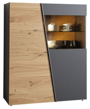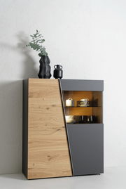 Erleben Sie Exklusivität und Natürlichkeit mit dem Voglauer Highboard BEZATONO LIVING. Dieses stilvolle Möbelstück kombiniert die Wärme von wilder Eiche mit der zeitlosen Eleganz von Sicherheitsglas. Die grifflosen Drehtüren sorgen für ein minimalistisches Design und bieten gleichzeitig praktischen Stauraum. Das Highboard besteht aus hochwertigen Teilmassivholz und anthrazitfarbenen, pulverbeschichteten Metallteilen, die sich perfekt in jedes Wohnambiente einfügen. Die Kombination aus einer Holztür auf der linken Seite und einer Holz-/Glastür auf der rechten Seite verleiht dem Möbelstück eine moderne Optik. Parsolglas in Grau rundet das edle Design ab.