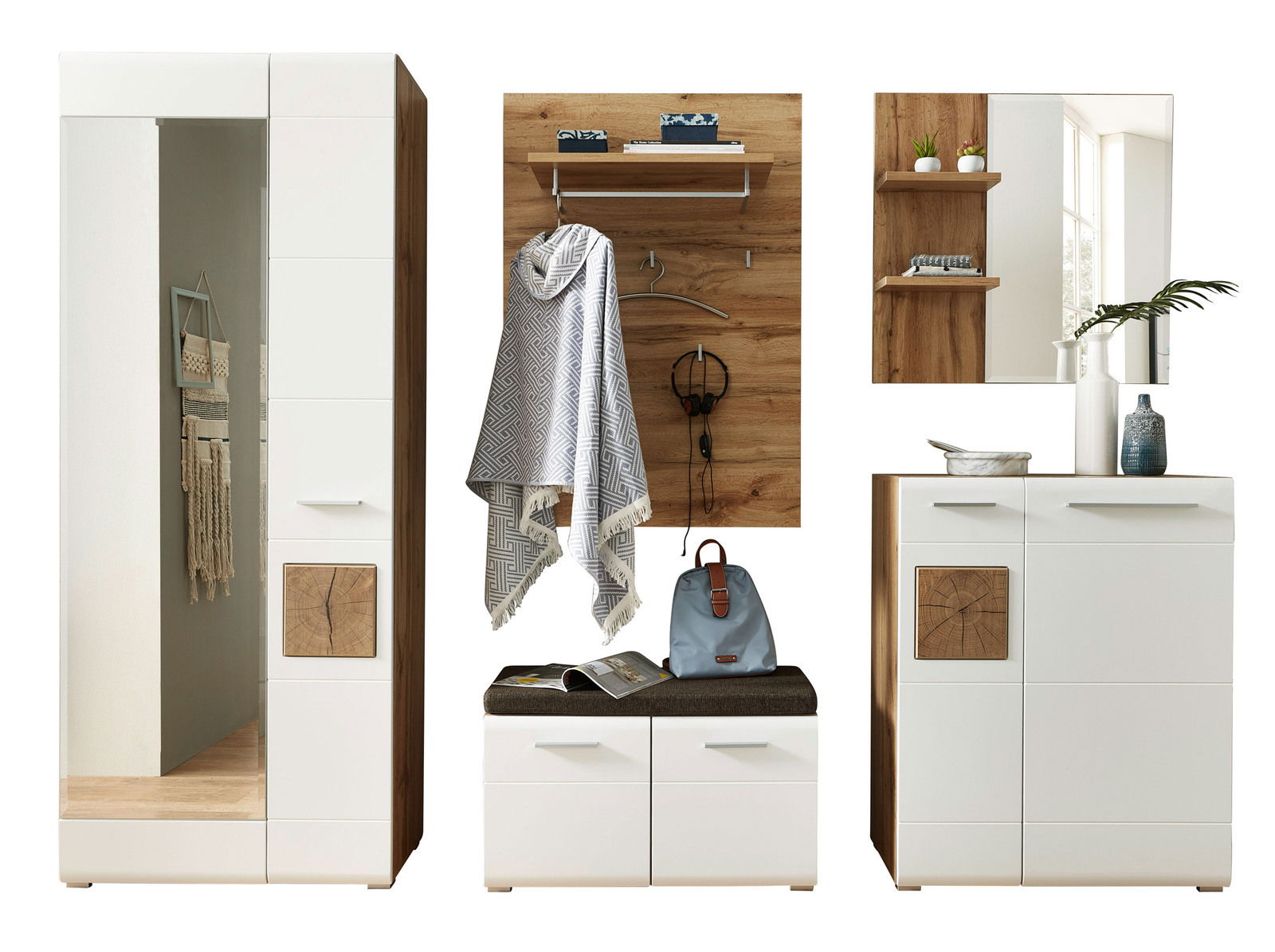 Erleben Sie stilvolle Eleganz mit dem Voleo Garderoben-Set LOOP, das in einem modernen und trendigen Design überzeugt. Die Kombination aus weißem Supermatt-Laminat und einer Eiche Altholz Nachbildung schafft eine harmonische Atmosphäre in Ihrem Eingangsbereich. Die Hirnholz Nachbildung und die silbermatten Kunststoffgriffe setzen dezente Akzente, die das Gesamtbild abrunden. Dieses Set umfasst einen großzügigen Garderobenschrank mit Drehtüren, einen praktischen Schuhschrank, eine komfortable Bank, ein stilvolles Paneel und einen Spiegel. Mit vier Türen und einem Softclose-Mechanismus bietet dieses Set sowohl Funktionalität als auch Ästhetik in einem zeitlosen Stil.
