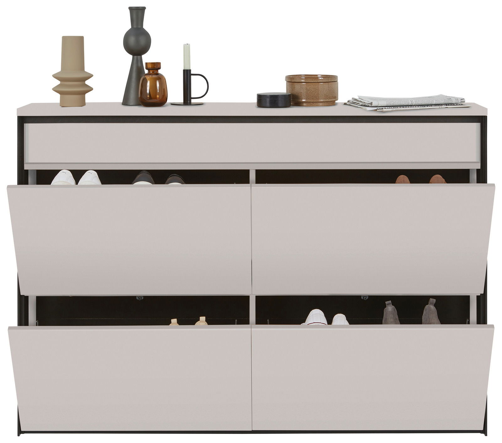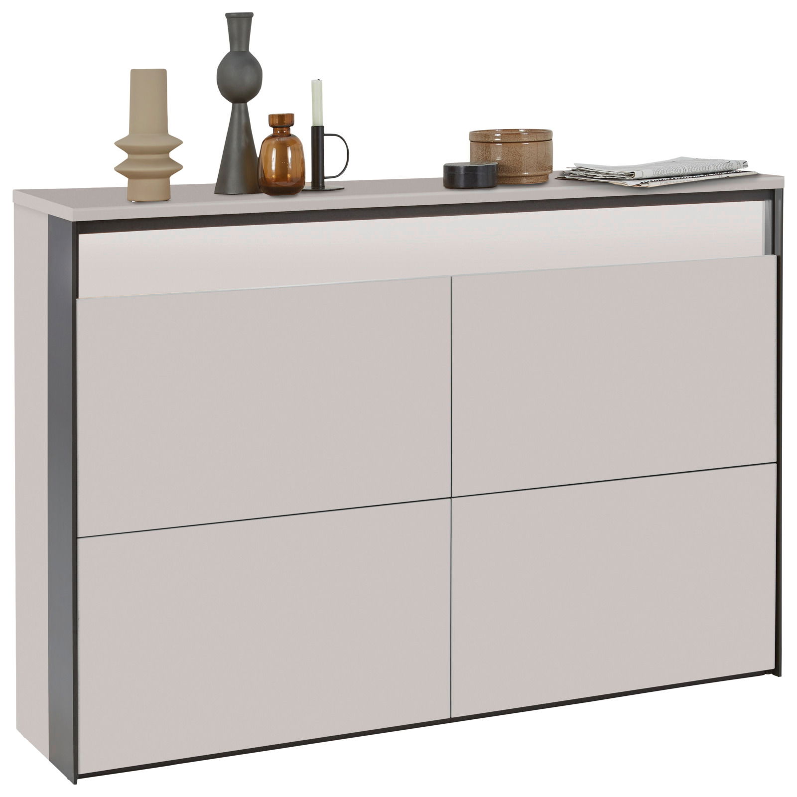 Der Voleo Hängeschuhschrank ZAYA vereint modernes Design mit praktischer Funktionalität. In elegantem Dekor Kaschmir-Beige gehalten und mit stilvollen schwarzen MDF Leisten akzentuiert, fügt sich dieser Schrank nahtlos in jedes moderne Zuhause ein. Die hochwertige Holznachbildung sorgt für eine ansprechende Optik und Langlebigkeit. Dank der Push-to-open Griffe genießen Sie ein müheloses Öffnen und Schließen der Schranktüren. Die integrierte Beleuchtung setzt Ihre Schuhsammlung perfekt in Szene und schafft eine einladende Atmosphäre. Der hängende Aufbau spart Platz und lässt den Raum größer wirken, während das puristische Design den Fokus auf Ihre Einrichtung legt.