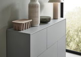Das Voleo Highboard NAOMI vereint modernes Design mit praktischer Funktionalität und ist die perfekte Ergänzung für Ihr stilvolles Interieur. In einem eleganten Graubeige gehalten, fügt es sich nahtlos in jeden Raum ein. Die harmonische Kombination aus Dekor Naturgrau und der Melaminharzbeschichtung verleiht dem Highboard einen zeitlosen Charakter. Die zwei Schubladenfronten in Lindberg-Eiche oder Naturgrau (frei wählbar) setzen einen natürlichen Akzent und sorgen für einen modernen Look. Mit zwei Drehtüren und vier Schubladen bietet das Highboard großzügigen Stauraum für all Ihre Utensilien. Die Push-to-open-Griffe und die Softclose-Funktion garantieren ein komfortables und geräuschloses Öffnen und Schließen.