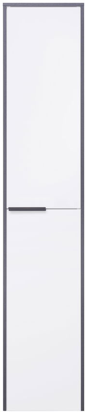 Eine ästhetische Bereicherung für moderne Badezimmer ist der Voleo Hochschrank rechts "STELLA" mit mattweißem Körper und weißer Front mit Hochglanz-Finish. Schwarze Metallgriffleisten und Dekorkanten (seitlich) unterstreichen das geradlinige, klassische Design.
