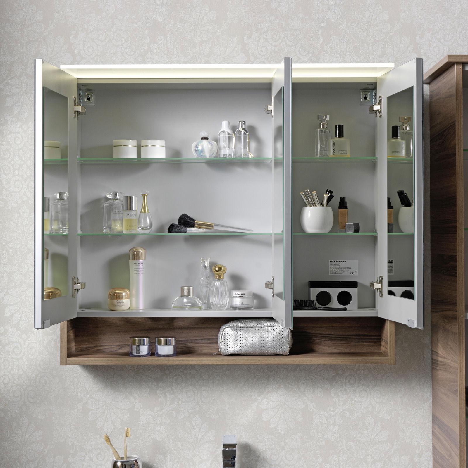Der Voleo Spiegelschrank LOUISIANA besticht durch seinen klassischen Stil und die edle nussbaumfarbene Optik. Mit einem Korpus und Hauptfarben in Nussbaum verleiht dieser Spiegelschrank Ihrem Badezimmer eine warme und einladende Atmosphäre. Aus hochwertiger Holznachbildung gefertigt, bietet er nicht nur eine ansprechende Ästhetik, sondern auch Langlebigkeit und Stabilität. Der Spiegelschrank verfügt über drei Drehtüren, die ausreichend Stauraum für Ihre Pflegeprodukte bieten. Integrierte LED-Leuchtmittel sorgen für eine optimale Beleuchtung und setzen Ihren Raum perfekt in Szene.