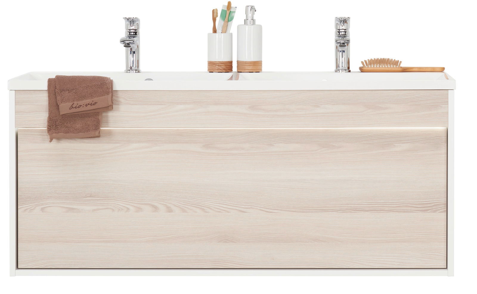 Der Voleo Waschplatz FREYA besticht durch seinen klassischen Stil und hochwertige Verarbeitung. Die elegante Farbgebung mit einer Front in Esche und einem Korpus in Weiss fügt sich harmonisch in jedes Badezimmerambiente ein. Dank der hängenden Aufstellung wirkt der Waschplatz besonders leicht und modern. Das Hauptmaterial besteht aus einer robusten Holznachbildung, die Langlebigkeit garantiert. Ein besonderes Highlight ist die integrierte Softclose-Funktion, die ein sanftes und geräuschloses Schliessen der Schublade ermöglicht. Die Push-to-open-Griffe runden das elegante Design ab und sorgen für ein bequemes Handling.