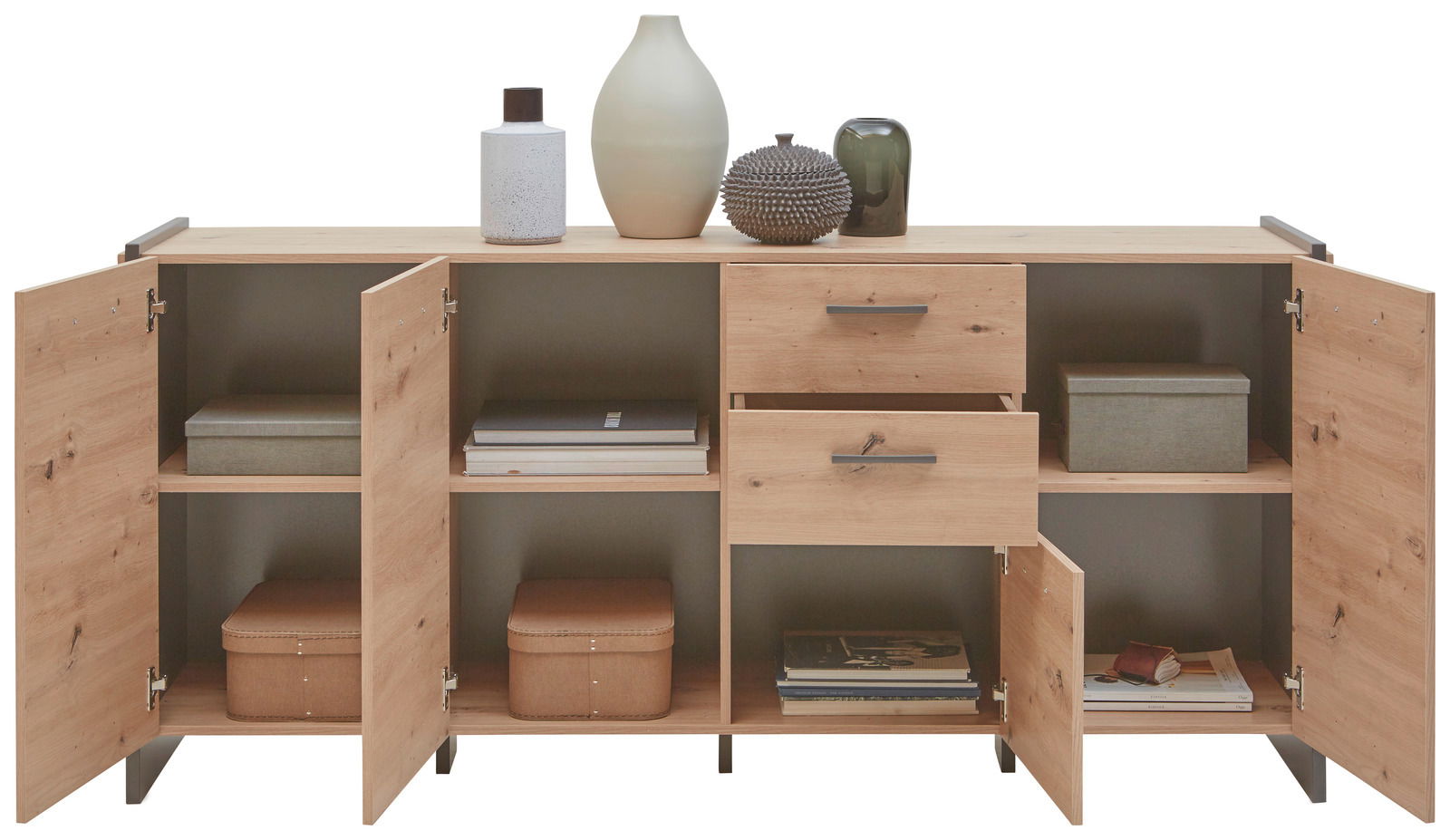 Das Board FLASH sorgt für bewundernde Blicke. Bei dieser Kommode können Sie auf bewährte Markenqualität von Voleo bauen. Das Modell FLASH überzeugt mit vier Drehtüren mit Platz zum Unterbringen verschiedenster Gegenstände dahinter und sorgt mit seinen zwei Schubladen für Ordnung in Ihrem Zuhause. Es punktet mit einer praktischen Soft-Close-Funktion. Der Schubladenschrank ist aus Holz-Nachbildung gefertigt und kann auch optisch durch sein modernes Design überzeugen. Das Modell FLASH hat ein Breitenmass von insgesamt 186,5 cm, eine Höhe von 86,1 cm sowie eine Tiefe von 41,3 cm. Das 64 kg schwere Möbel vermag mit Fronten aus einem eichefarbenen Material zu begeistern. Diese Kommode verleiht jedem Zuhause ein heimeliges Ambiente.