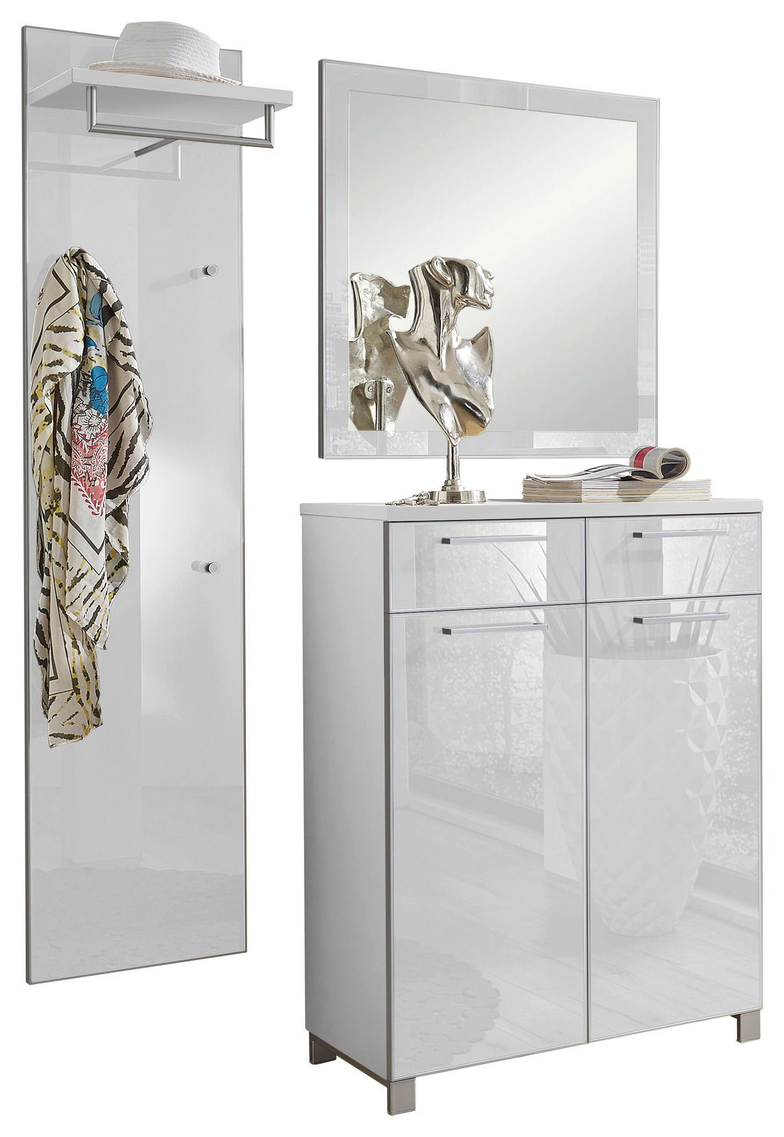 Das VOSS Garderoben-Set 3-tlg. SANTINA vereint modernes Design mit hoher Funktionalität und fügt sich nahtlos in jedes Zuhause ein. Die elegante Kombination aus weißem Glas an Front und Paneel sowie einem weißen Lackkorpus schafft eine helle und freundliche Atmosphäre. Die alufarbenen Rahmen, Griffe und Haken setzen stilvolle Akzente und sorgen dafür, dass das Set nicht nur praktisch, sondern auch ein echter Hingucker ist. Dieses Set besteht aus einem geräumigen Schuhschrank, einem eleganten Spiegel und einem funktionalen Paneel, das für Ordnung und Struktur in Ihrem Eingangsbereich sorgt. Die hochwertige Holznachbildung garantiert Langlebigkeit und zeitloses Design.