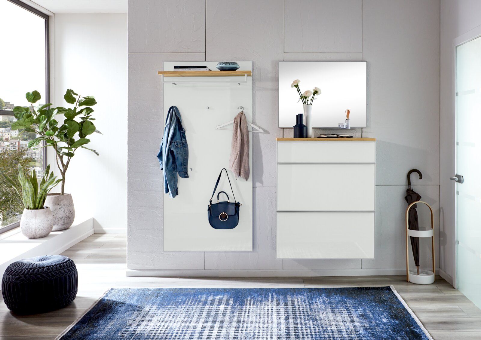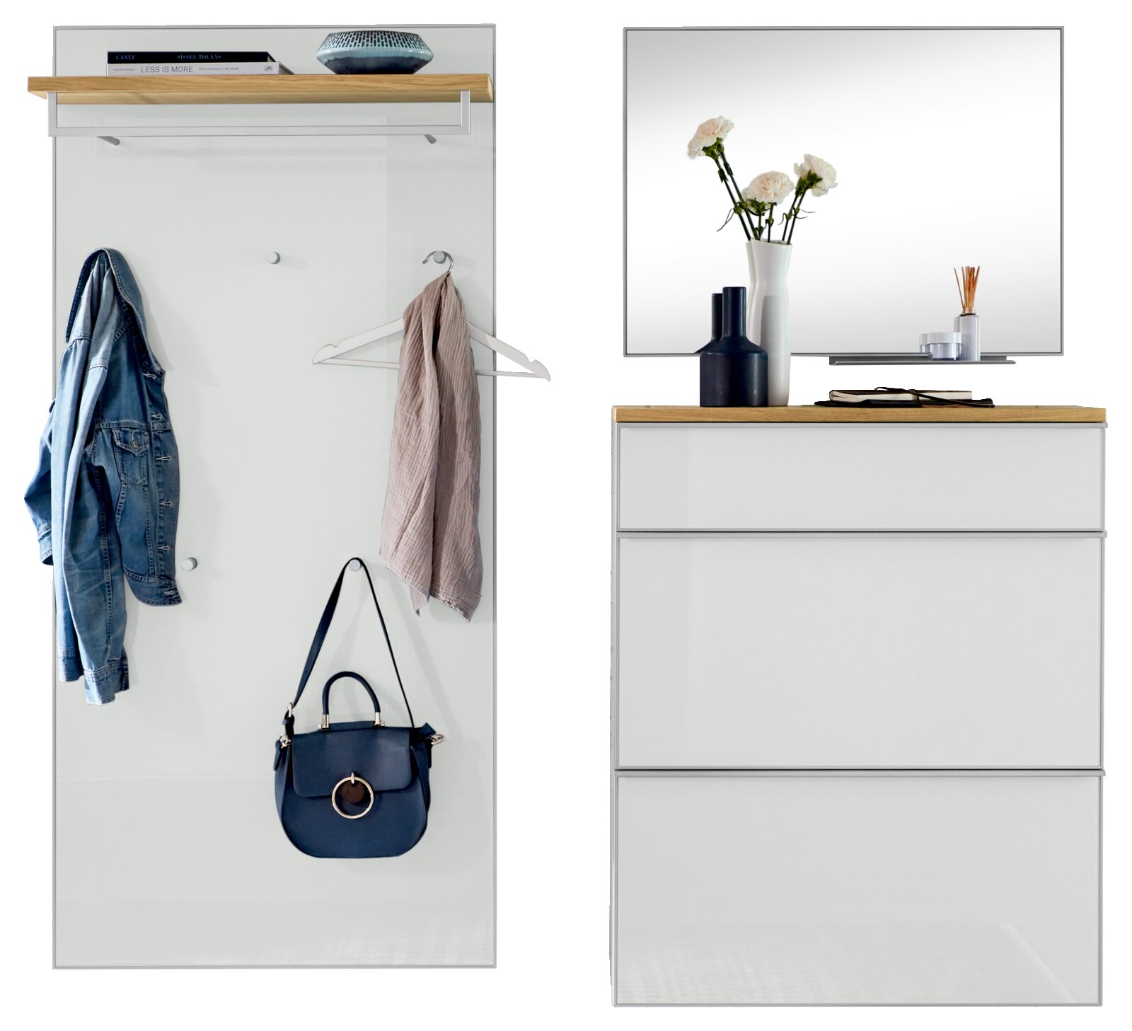 Das VOSS Garderoben-Set 4-tlg. VORTINA vereint modernes Design mit praktischer Funktionalität und ist eine stilvolle Ergänzung für jeden Eingangsbereich. Das Set besticht durch seine klare Optik in Weiß, die durch hochwertige Materialien wie hinterlackiertes Glas und ein Abdeckblatt aus Balkeneiche furniert ergänzt wird. Der Korpus in Lack Weiß und die Front mit Optiweiß-Glas verleihen dem Set eine elegante Ausstrahlung. Mit einer Griffleiste ausgestattet, bietet das Set eine harmonische Kombination aus Design und Komfort. Die alufarbigen Rahmen runden das Gesamtbild stilvoll ab und setzen einen modernen Akzent.