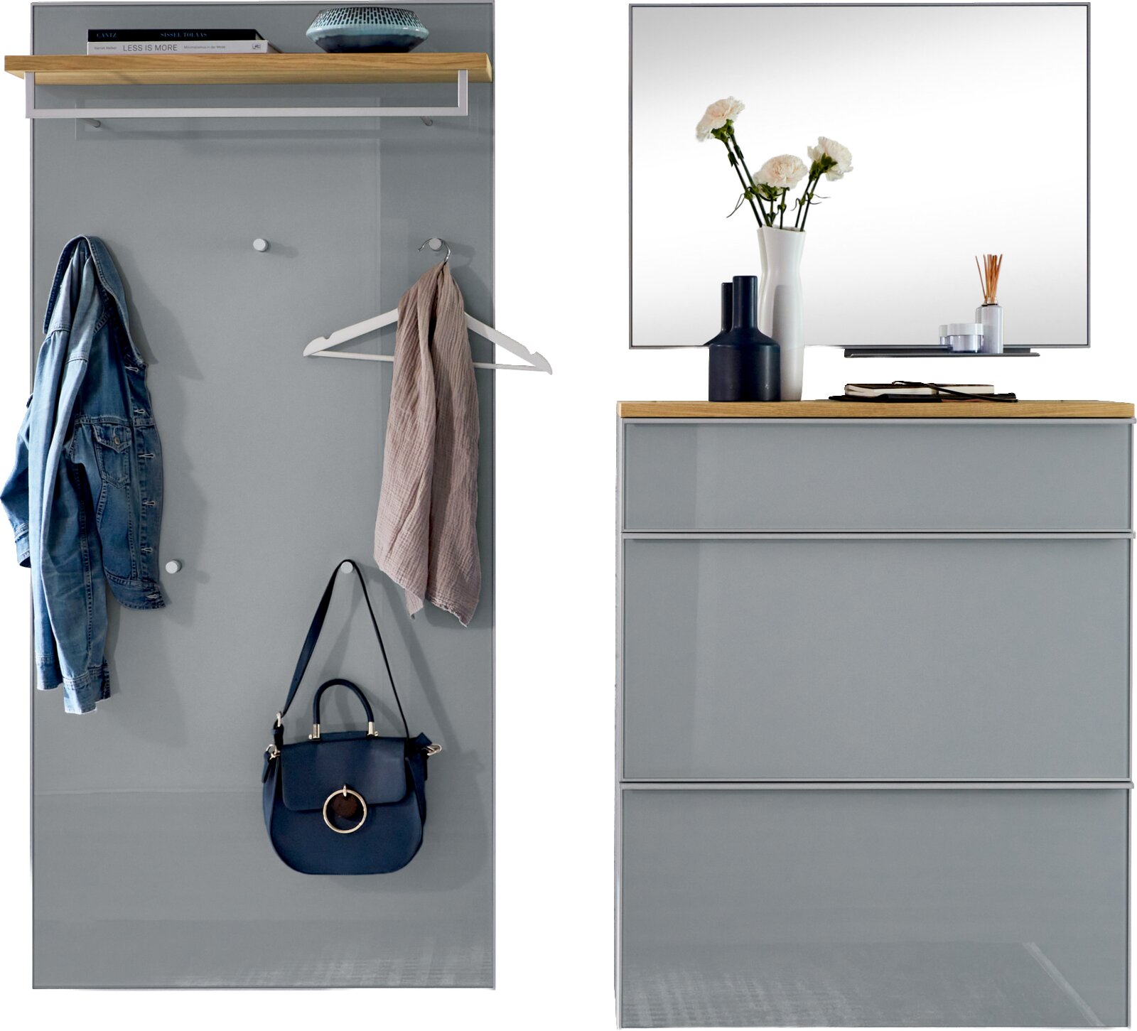 VOSS Garderoben-Set 4-tlg. VORTINA – Funktionalität trifft auf Stil Das VOSS Garderoben-Set 4-tlg. VORTINA bietet nicht nur optische Highlights, sondern auch praktische Funktionen. Der Hängeschuhschrank verfügt über eine Schublade, die zusätzlichen Stauraum für kleinere Accessoires bietet. Das Garderobenpaneel mit Ablageboard und Spiegel sorgt dafür, dass Sie Ihren Eingangsbereich optimal nutzen können. Die hochwertigen Materialien wie perlgraues Glas und Balkeneiche Furnier garantieren Langlebigkeit und Stabilität. Verleihen Sie Ihrem Zuhause eine moderne Note und profitieren Sie von der durchdachten Kombination aus Design und Funktion. Bestellen Sie jetzt und erleben Sie die perfekte Symbiose aus Stil und Praktikabilität!