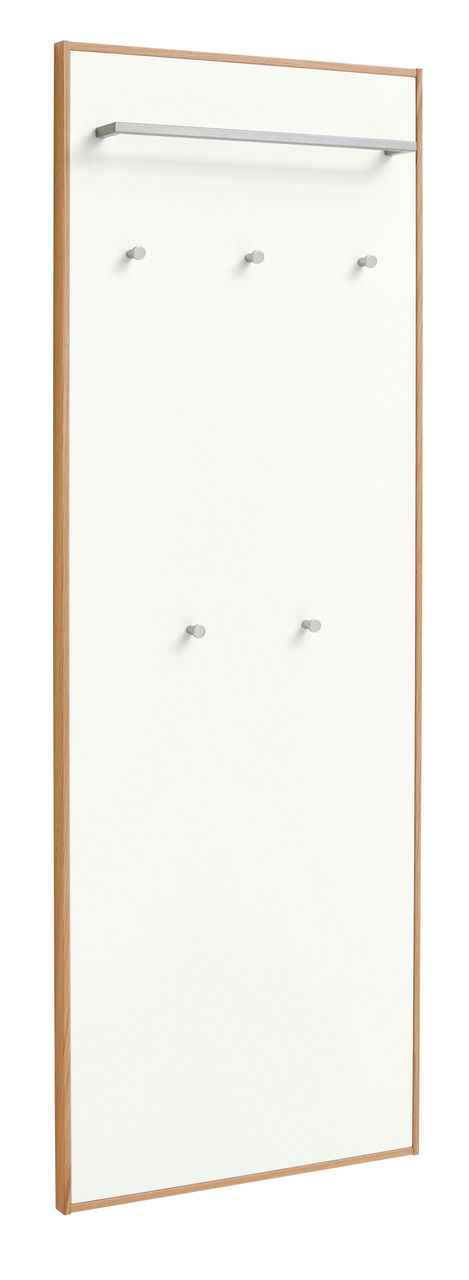 Mit dem weiß lackierten Paneel und dem teilmassiven Rahmen in Eiche bianco setzt das Voss Garderobenpaneel flach/lang "V100" moderne Trends und passt bestens in einen großen Hausflur. Mit platzsparenden Maßen von B/H/T ca. 60 x 170 x 10 cm bietet es genug Raum für 5 Kleiderhaken und 1 Kleiderstange – ideal für Familien, WGs oder wenn Sie gern viele Freunde zu Besuch haben. Mit 16 kg Eigengewicht lässt sich die Garderobe zudem stabil an jeder Wand verankern. Sorgen Sie für Ordnung im Hausflur mit dem trendigen Voss Garderobenpaneel flach/lang "V100"!