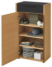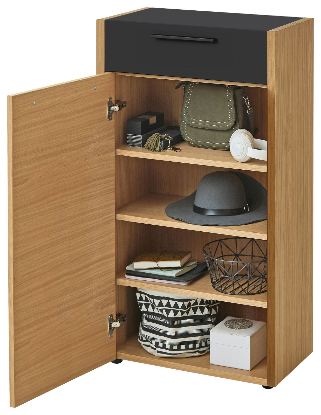 Das B/H/T ca. 61 x 103 x 37 cm Gesamtmaß des Beistellers ist die Lösung für schmale Flurbereiche (Gewicht 43 kg). Drei höhenverstellbare Fachböden sowie die gedämpfte Drehtür (Anschlag links) schaffen Ordnung. Der praktische Schubkasten (Vollauszug/Selbsteinzug) bietet Platz für Accessoires. Kaufen Sie die Voss Kommode "LEVIO"!