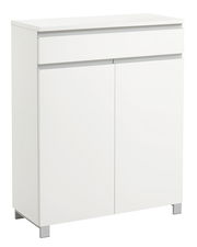 Standhafter SchuhschrankDas Möbel aus stabiler Holznachbildung macht sich mit B/H/T ca. 84 x 108 x 37 cm klein und kompakt. Damit seine 46 kg Gewicht sicher stehen, tragen es vier stabile Füße. Im Schubkasten parken Sie Schuhputzzeug, während hinter den beiden Drehtüren vier Schuhgitterböden auf ca. 16 Paar Schuhe warten. ONLINE ONLY: Bestellen Sie rasch den Voss Schuhschrank "SALEA"!