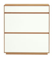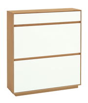 Mit seiner geradlinigen Gestaltung harmoniert der Voss Schuhschrank "V100" zum nordischen Wohnambiente mit dezenter Landhausnote. Seine grifflose lackweiße Front gibt zusammen mit dem Korpus im hellbraunen Eiche-bianco-Dekor ein elegantes Erscheinungsbild ab.