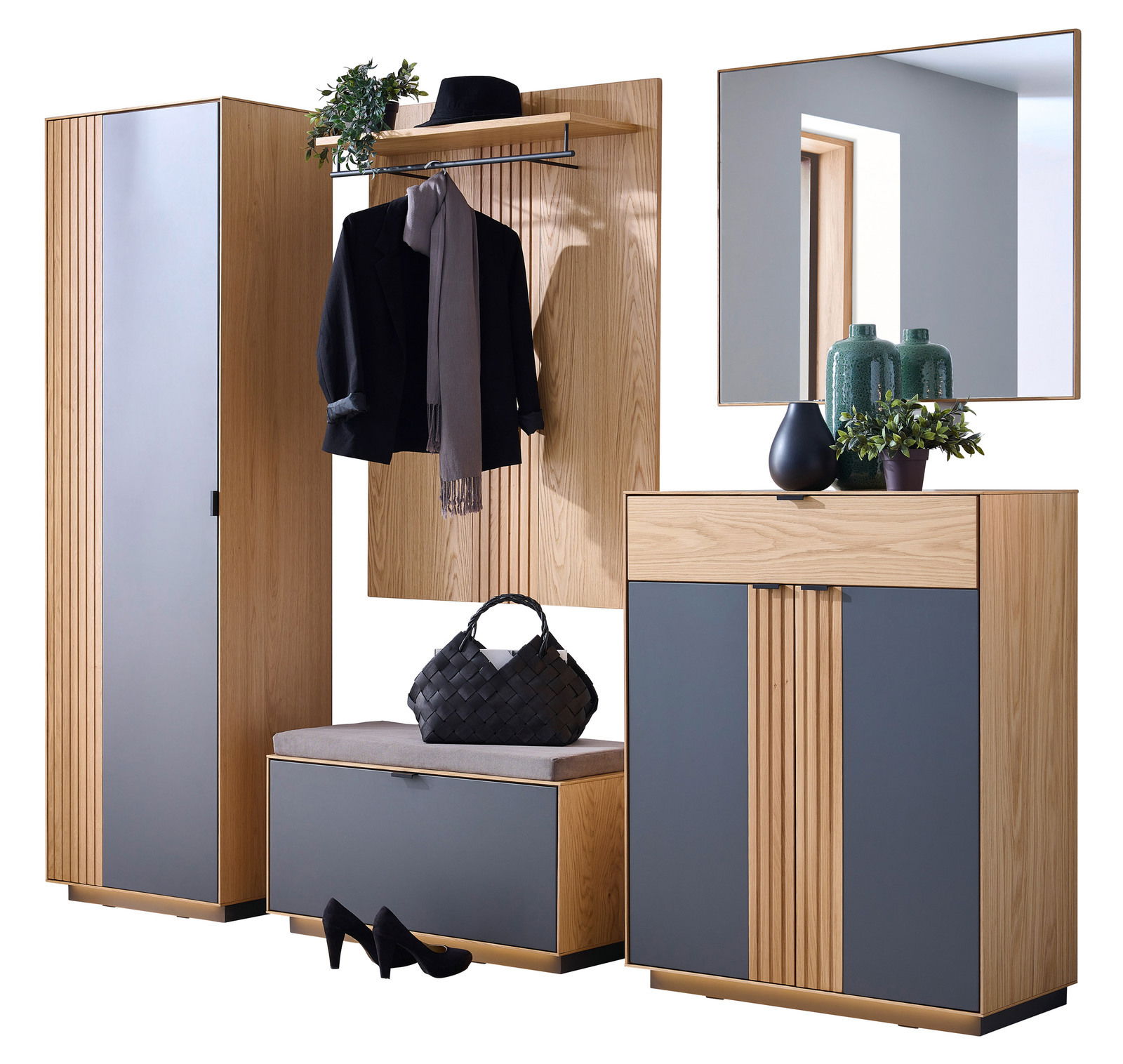 Garderobenkombination TIMOUR - Funktionalität trifft Natürlichkeit Die Waldwelt Garderobenkombination TIMOUR überzeugt nicht nur durch ihr ansprechendes Design, sondern auch durch ihre Funktionalität. Mit Türen und Schubladen versehen, bietet sie ausreichend Platz für Jacken, Schuhe und Accessoires. Das teilmassive Material garantiert Langlebigkeit und Stabilität, während das Rillenprofil der Fronten einen besonderen optischen Reiz bietet. Die Kombination aus Asteiche und grauen Akzenten verleiht Ihrem Flur eine stilvolle und gleichzeitig natürliche Note. Verleihen Sie Ihrem Eingangsbereich einen Hauch von Eleganz und bestellen Sie die Garderobenkombination TIMOUR noch heute!