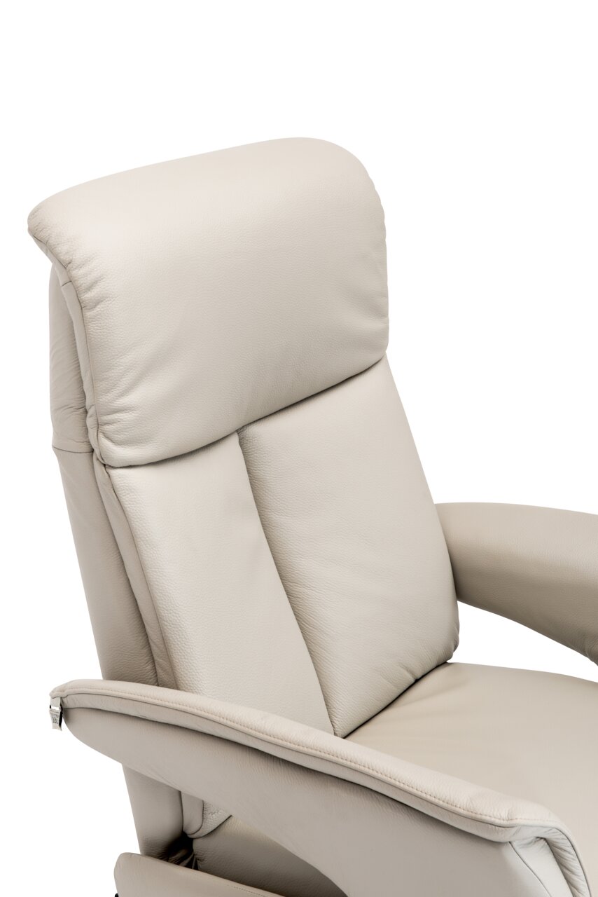 Entdecken Sie den Welnova Relaxsessel 8035 SUPERIOR, der mit seinem modernen Stil und trendigen Design besticht. Der Sessel ist mit hochwertigem Leder in Soleda silver grey bezogen und verleiht Ihrem Wohnraum einen Hauch von Eleganz. Mit einer Sitzhöhe von 44 cm und einer Sitztiefe von 52 cm bietet er optimalen Komfort. Die Nosagunterfederung sorgt für angenehmen Sitzkomfort, während die integrierte Fußstütze und der manuell verstellbare Kopfteilbereich zusätzlichen Luxus bieten. Der schwarze Metallfuß ist nicht nur drehbar, sondern auch robust und belastbar bis zu 120 kg. Ein schwarzer Rückengriff rundet das Design ab.