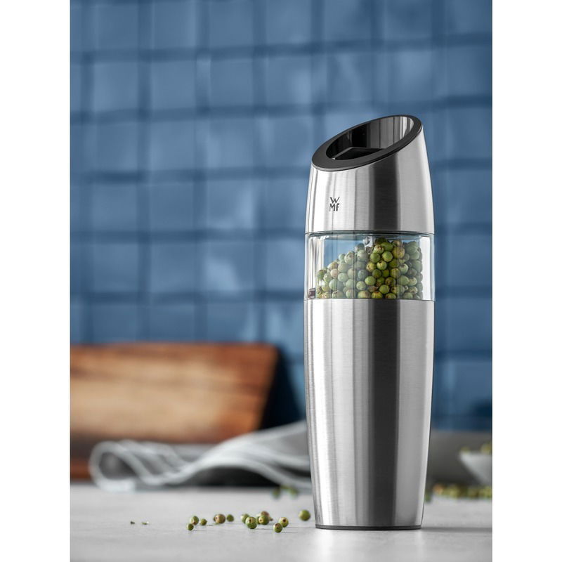 Mit der WMF Elektrische Mühle erhalten Sie eine Pfeffer- oder Salzmühle in modernem Edelstahl-Design. Sie erweist sich nicht nur beim Kochen als wertvoll, sondern sieht auch auf der gedeckten Tafel äußerst elegant aus. Für genau die richtige Körnung sorgt das langlebige und stufenlos einstellbare Keramikmahlwerk. Die ca. 20 cm hohe Mühle wiegt 0,55 kg und besteht aus rostfreiem Cromargan (Edelstahl) 18/10 mit einem klaren Acrylglas-Behälter. Letzterer kann in der Spülmaschine gereinigt werden. Im Lieferumfang sind außerdem sechs AAA-Batterien à 1,5 V enthalten. Bestellen Sie sich die WMF Elektrische Mühle gleich online!