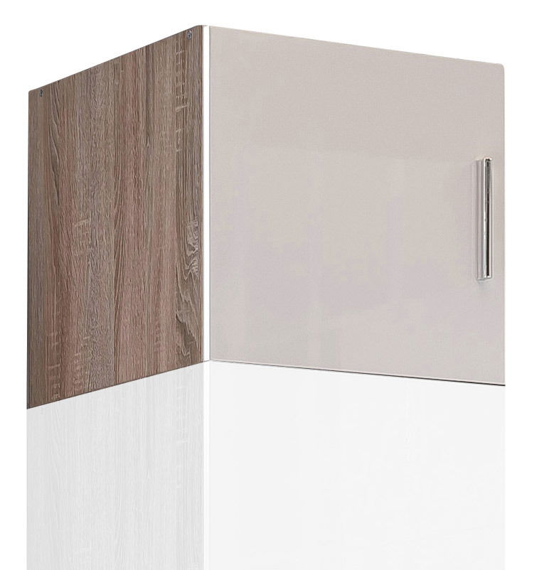 Der XORA Aufsatz T40 MALTA sticht durch sein modernes, trendiges Design ins Auge. Die Front in Hochglanzlack Weiß ist ein echter Hingucker und fügt sich durch die neutrale Farbe nahtlos in jede Wohnlandschaft ein. Der Korpus in Eiche sägerau/sonoma verleiht dem Aufsatz eine angenehme, warme Ausstrahlung und harmoniert perfekt mit der weißen Front. Der Aufsatz hat eine Höhe von 40 cm, eine Tiefe von 40 cm und eine Breite von 45 cm und bietet somit ausreichend Stauraum. Der Aufsatz ist mit einer Drehtür ausgestattet und verfügt über einen Griff für eine einfache Handhabung.