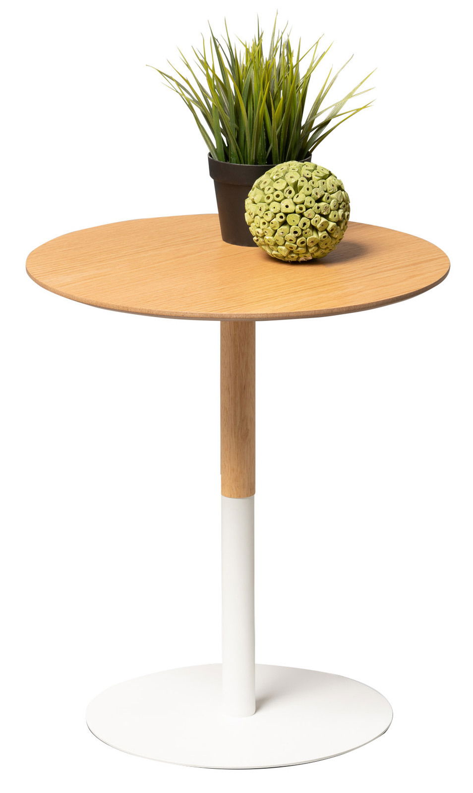 Der XORA Beistelltisch ZOE ist eine perfekte Mischung aus Design und Funktionalität. Mit seinem rechteckigen Design und der modernen Eicheoptik lässt er sich nahtlos in jede Einrichtung einfügen. Das Modell ist 46 cm hoch und hat einen Durchmesser von 40 cm. Die Deckplatte besteht aus MDF mit Eichefurnier in Naturfarben, während die Tischbeine aus Gummibaumholz in Naturfarben und weißem Metall gefertigt sind. Die Bodenplatte aus weißem Metall gibt dem Tisch zusätzliche Stabilität. Beachten Sie bitte, dass die Dekoration nicht im Lieferumfang enthalten ist.
