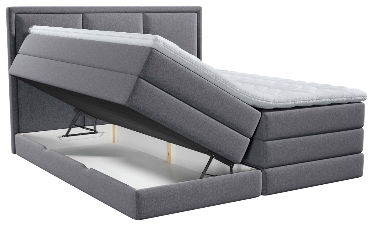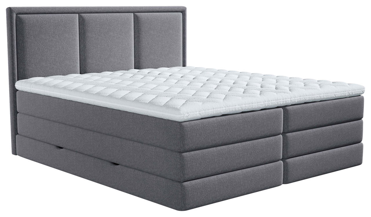 Das Xora Boxspringbett "SWING" in harmonischem Grau bringt Komfort und Stil in Ihren Schlafbereich. Das B/H/T ca. 186 x 120 x 215 cm große Bett mit gepolstertem Kopfteil bietet mit der 180 x 200 cm großen Liegefläche gemütlichen Platz für zwei. Für perfekte Liegebedingungen sorgen zwei 7-Zonen-Taschenfederkernmatratzen auf zwei Bonellfederkernmatratzen. Der mitgelieferte durchgehende Kaltschaumtopper verbessert den Liegekomfort, ist waschbar und sorgt für Hygiene. Ersatz-Bettwäsche wird praktisch im Bettkasten mit Gasdruckfedern untergebracht. Entscheiden Sie sich für das Xora Boxspringbett "SWING"!