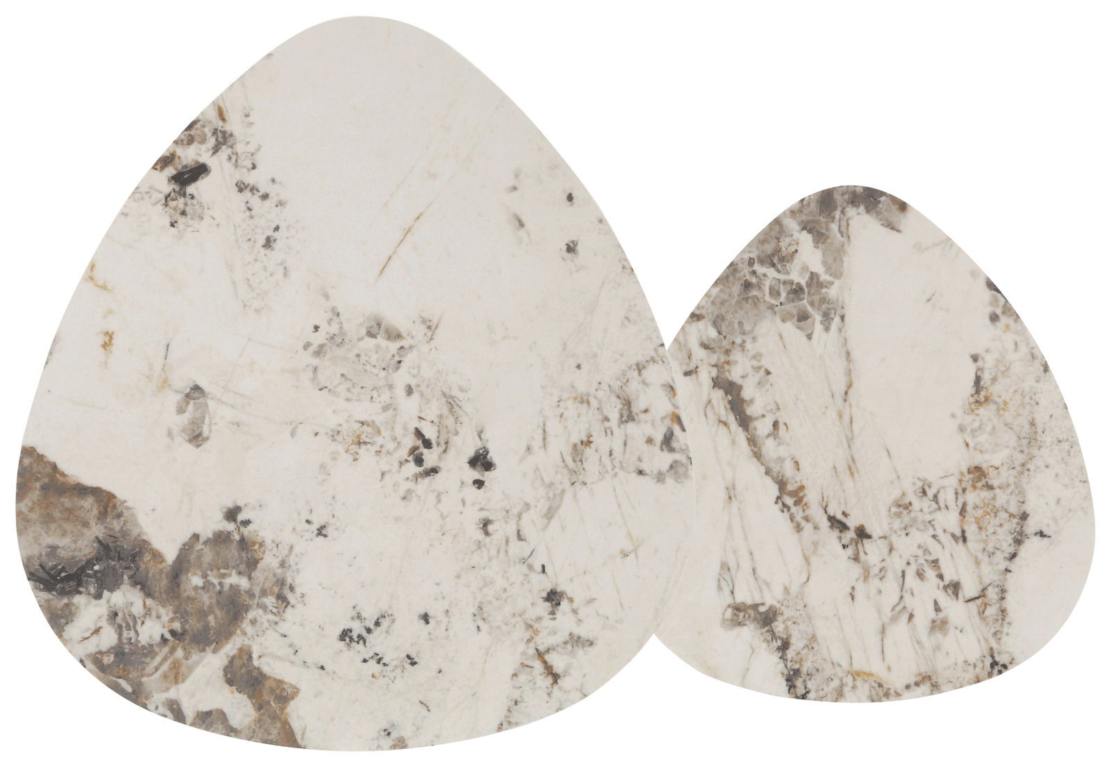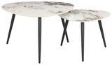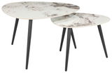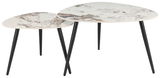 Entdecken Sie das XORA Couchtisch-Set RITA, das mit seiner modernen und trendigen Formgebung jedem Wohnzimmer einen Hauch von Eleganz verleiht. Dieses Set besteht aus zwei Tischen, die harmonisch aufeinander abgestimmt sind. Der größere Tisch misst etwa 84 x 77 cm mit einer Höhe von 45,5 cm, während der kleinere Tisch ca. 60 x 55 cm groß ist und eine Höhe von 40 cm aufweist. Beide Tische beeindrucken durch ihre weiße Hauptfarbe und das pulverbeschichtete Gestell, das für Stabilität sorgt. Die Tischplatten aus hochwertiger Keramik verleihen dem Set einen besonderen Charme und zeichnen sich durch Langlebigkeit aus.