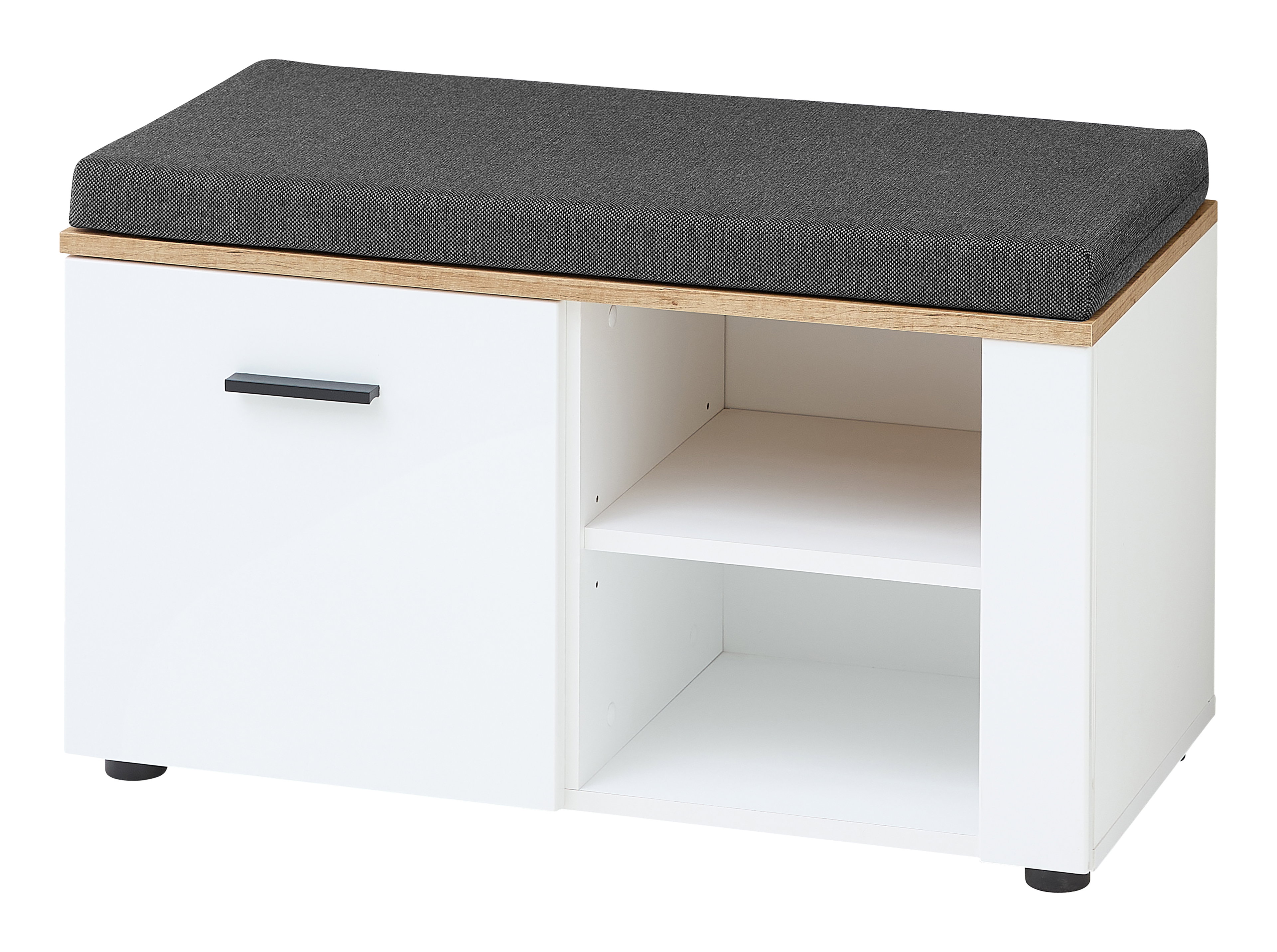 Die XORA Garderobenbank SPARKS vereint modernes Design mit funktionaler Eleganz. In einem trendigen Weiß gehalten, ergänzt durch schwarze Akzente, passt sie perfekt in jede moderne Einrichtung. Der Korpus und die Front aus hochwertiger Holznachbildung sorgen für eine langlebige und pflegeleichte Nutzung. Der Fuß aus robustem Kunststoff verleiht der Bank Stabilität. Die schwarz matten Griffe und das Sitzkissen in Anthrazit setzen stilvolle Akzente. Mit ihrer Drehtür und dem integrierten Einlegeboden bietet die Garderobenbank ausreichend Stauraum für Schuhe oder Accessoires. Dank der Softclose-Funktion schließen die Türen sanft und geräuschlos.