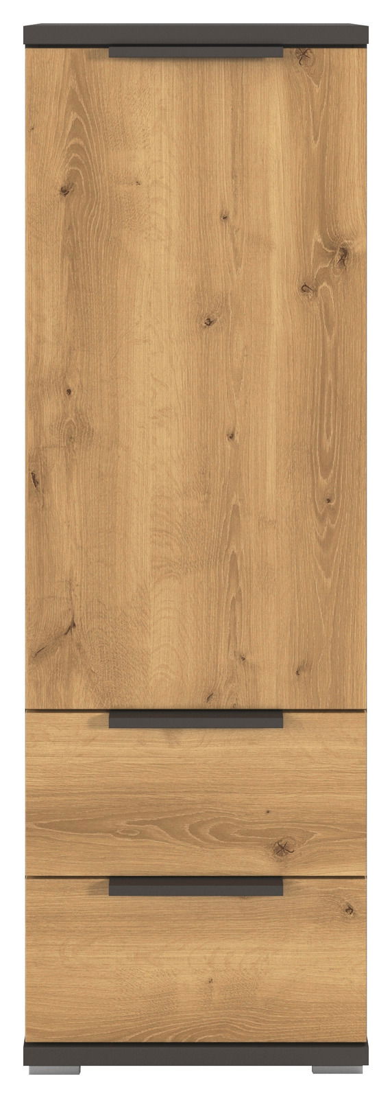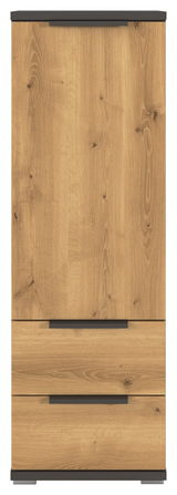 Die XORA Hoch-Kommode ENDORA vereint traditionelle Eleganz mit moderner Funktionalität. Diese stilvolle Kommode besticht durch ihre warme Eichenfront, die in Kombination mit dem graphitfarbenen Korpus einen zeitlosen Look erzeugt. Der graue Kunststofffuß sorgt für Stabilität und rundet das Design harmonisch ab. Ausgestattet mit einer praktischen Drehtür und zwei geräumigen Schubladen bietet sie ausreichend Stauraum für Ihre Bedürfnisse. Die Softclose-Technologie gewährleistet ein sanftes Schließen der Schubladen und Türen, was den täglichen Gebrauch besonders angenehm macht. Das hochwertige Holznachbildungs-Material sorgt für eine langlebige Nutzung und verleiht jedem Raum eine einladende Atmosphäre.