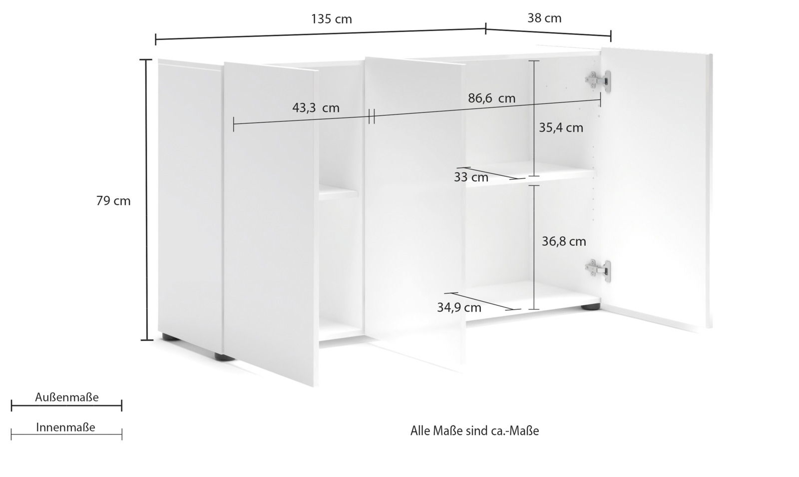 Die XORA Kommode MISTER LORD vereint modernes Design mit praktischer Funktionalität. Ihr elegantes Weiß in Hochglanzlackierung verleiht jedem Raum eine frische und zeitgemäße Atmosphäre. Diese Kommode beeindruckt durch ihre grifflosen Türen, die einen nahtlosen und minimalistischen Look bieten. Mit drei Drehtüren ausgestattet, bietet sie ausreichend Stauraum für verschiedene Wohnaccessoires. Das Hauptmaterial in Holznachbildung sorgt für eine robuste und langlebige Konstruktion, während die Kunststofffüße Stabilität und Langlebigkeit garantieren. Die Kommode ist die perfekte Ergänzung für ein stilvolles Zuhause, das Wert auf Design und Funktionalität legt.
