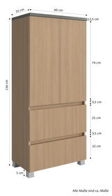 Der XORA Midischrank TOULON vereint modernes Design mit praktischer Funktionalität und ist die perfekte Ergänzung für Ihr Zuhause. Der Korpus und die Fronten in edler Eiche-Optik verleihen dem Schrank einen natürlichen und warmen Charakter, während die silbernen Füße für einen zeitgemäßen Kontrast sorgen. Der Verzicht auf Griffe unterstreicht das minimalistische Design und sorgt für eine klare, harmonische Optik. Die zwei Drehtüren öffnen sich dank Softclose-Funktion sanft und geräuschlos, was den täglichen Gebrauch besonders angenehm macht. Die Schubladen bieten zusätzlichen Stauraum und runden das praktische Design des Midischranks ab.