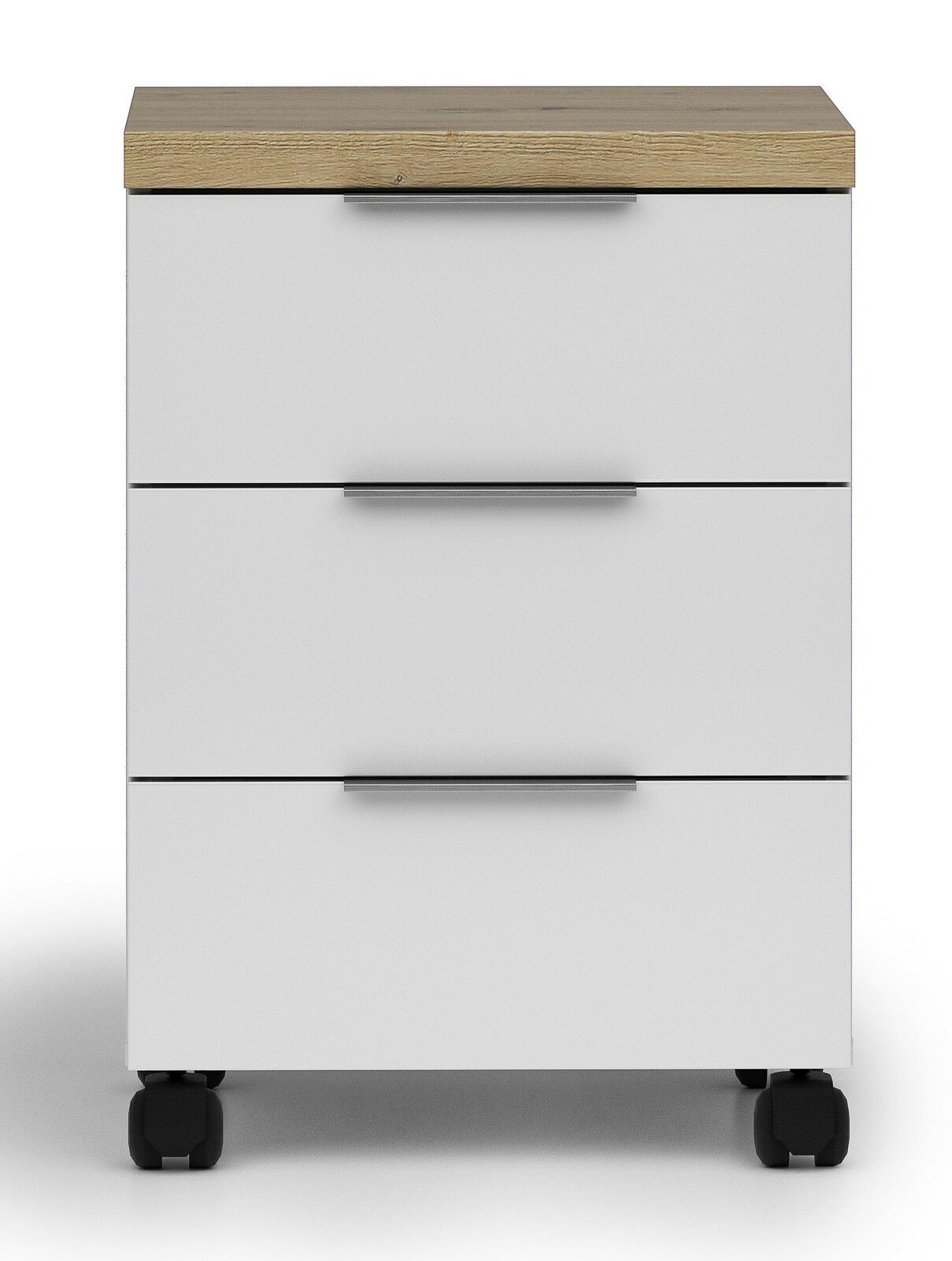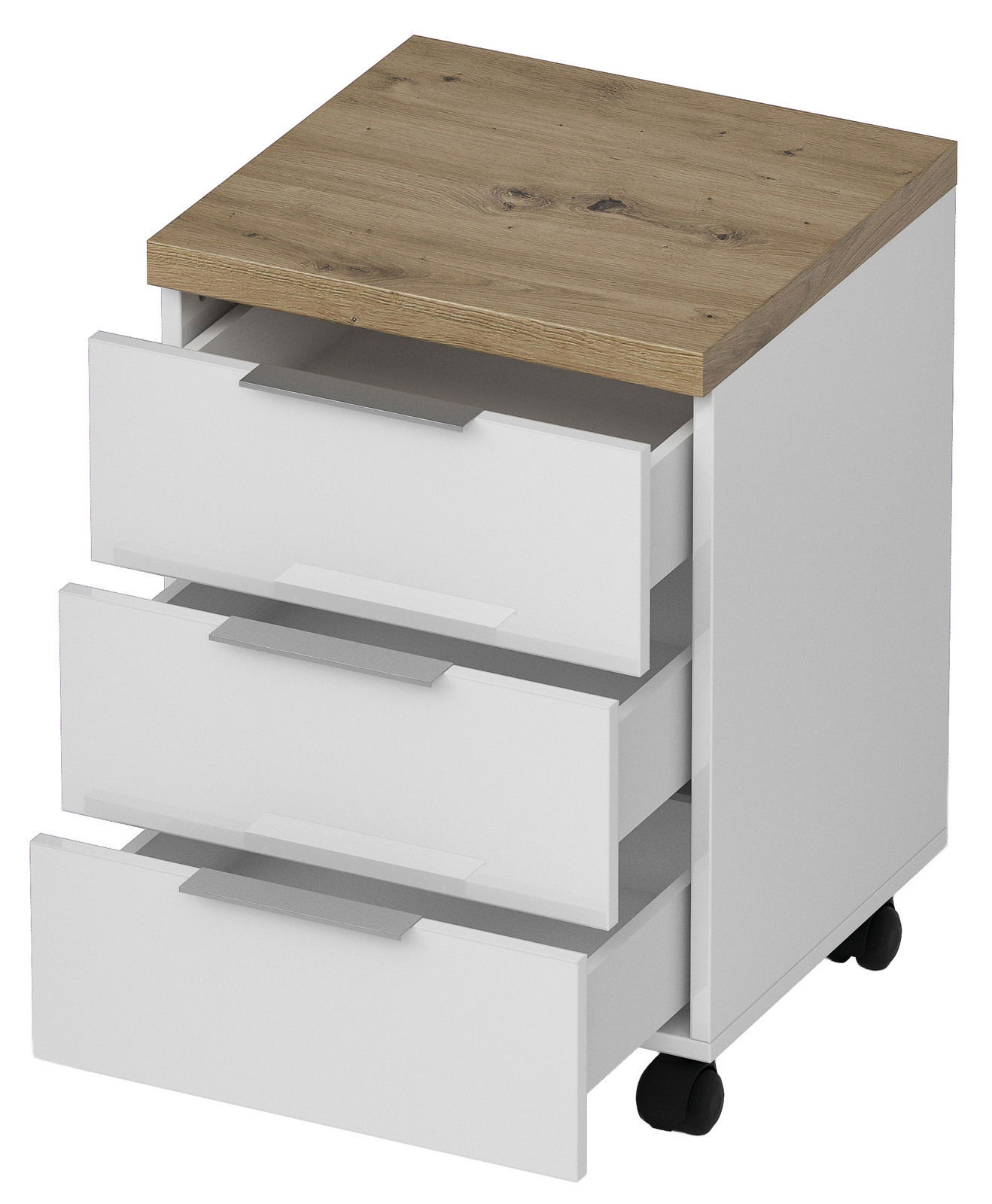 Der XORA Rollcontainer IDEA-OFFICE besticht durch sein modernes und stilvolles Design, das sich perfekt in jedes Büroambiente einfügt. Mit seiner weißen Hochglanz-Lackierung und der Oberplatte im Eiche Dekor strahlt er zeitlose Eleganz aus. Die klare Linienführung und die harmonische Farbgestaltung in Weiß verleihen diesem Rollcontainer einen trendigen Look. Ausgestattet mit drei geräumigen Schubladen bietet er ausreichend Stauraum für Ihre Büroartikel. Die langlebige Holznachbildung sorgt für Robustheit und Langlebigkeit. Die praktischen Griffe ermöglichen ein einfaches Öffnen und Schließen, während die Softclose-Funktion für ein sanftes und geräuschloses Schließen der Schubladen sorgt.