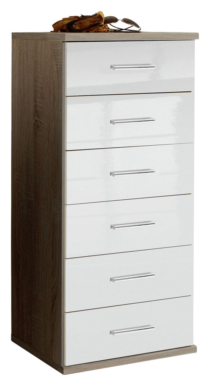 Schubkastenkommode MALTA - Der perfekte Stauraum in elegantem DesignSie suchen nach einer stilvollen Lösung, um Stauraum in Ihren vier Wänden zu schaffen? Dann ist die Schubkastenkommode MALTA die perfekte Wahl für Sie. Mit ihrer Front in Hochglanz Lack weiss und dem Korpus in Eiche sägerau/sonoma, fügt sie sich elegant in jeden Raum ein. Die sechs Schubladen bieten ausreichend Platz für all Ihre Habseligkeiten. Die Verwendung von Holznachbildung garantiert dabei eine hohe Beständigkeit und Langlebigkeit des Möbelstücks. Lassen Sie sich von der Qualität und dem Design der XORA Schubkastenkommode MALTA überzeugen und schaffen Sie Stauraum mit Stil in Ihren vier Wänden.