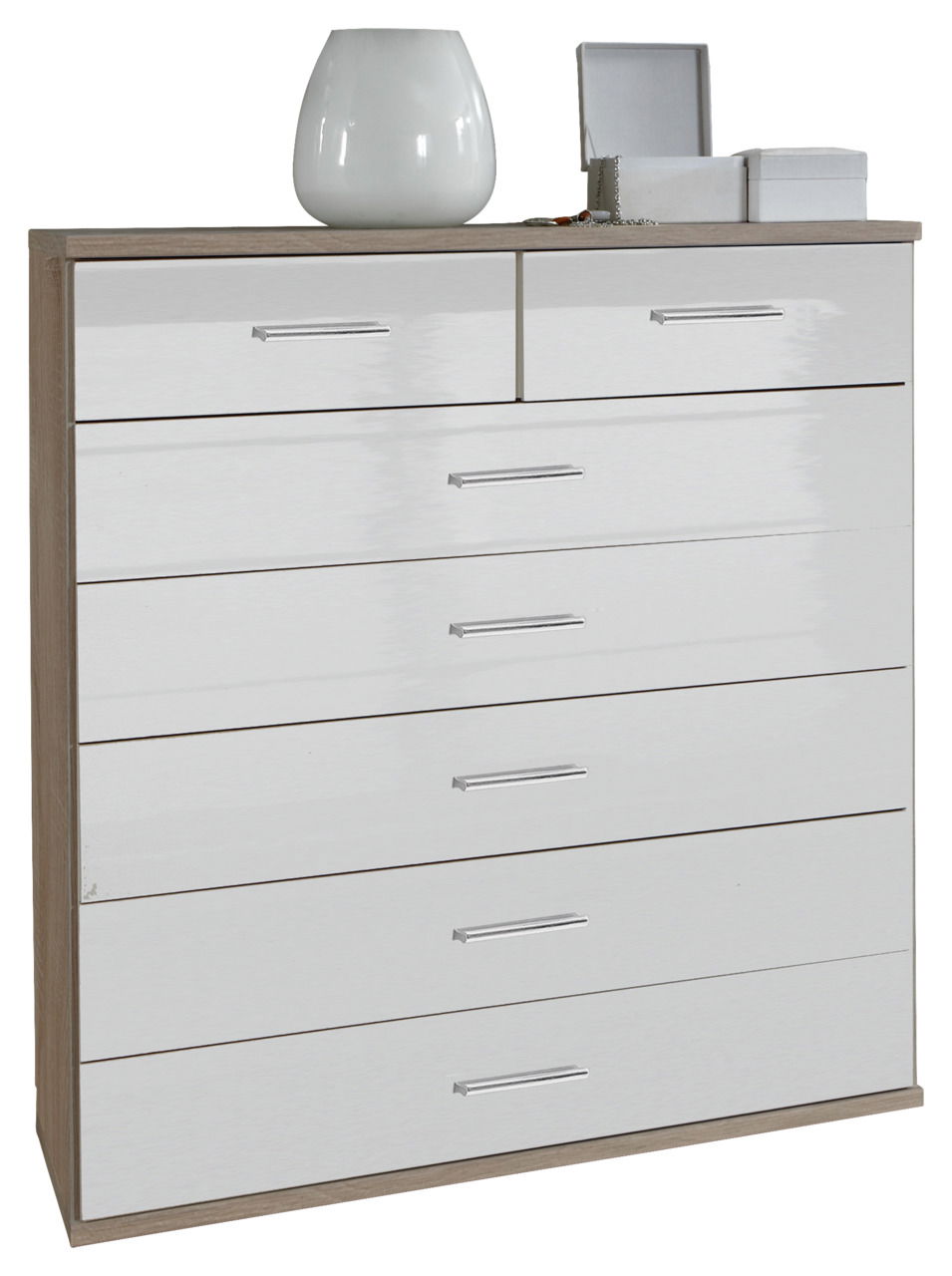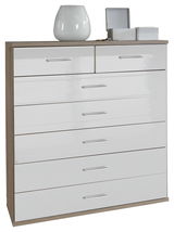 Die Schubkastenkommode MALTA von XORA ist ein echtes Schmuckstück für Ihr Zuhause. Mit ihrem modernen Design und der strahlend weissen Front fügt sie sich nahtlos in jede Einrichtung ein. Sie ist nicht nur ein optisches Highlight, sondern bietet mit sieben Schubkästen auch viel praktischen Stauraum. So können Sie all Ihre Habseligkeiten ordentlich und übersichtlich verstauen. Die Kommode ist aus Holz-Nachbildung gefertigt, was ihr eine natürliche und warme Ausstrahlung verleiht.