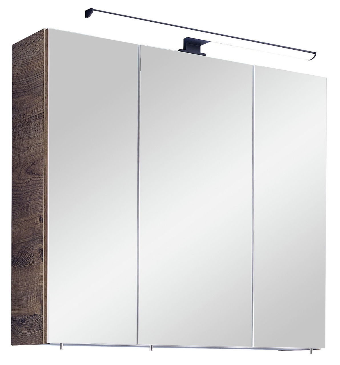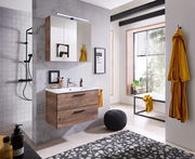 Schwarze Kanten bilden beim Xora Spiegelschrank 374 einen modernen Kontrast zum eichefarbenen Korpus. Im Badezimmer lässt er sich mit trendigen Armaturen kombinieren.