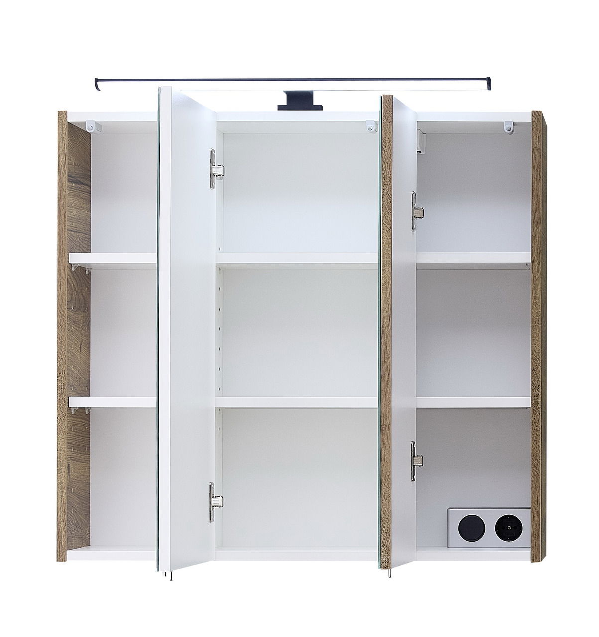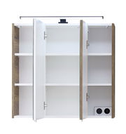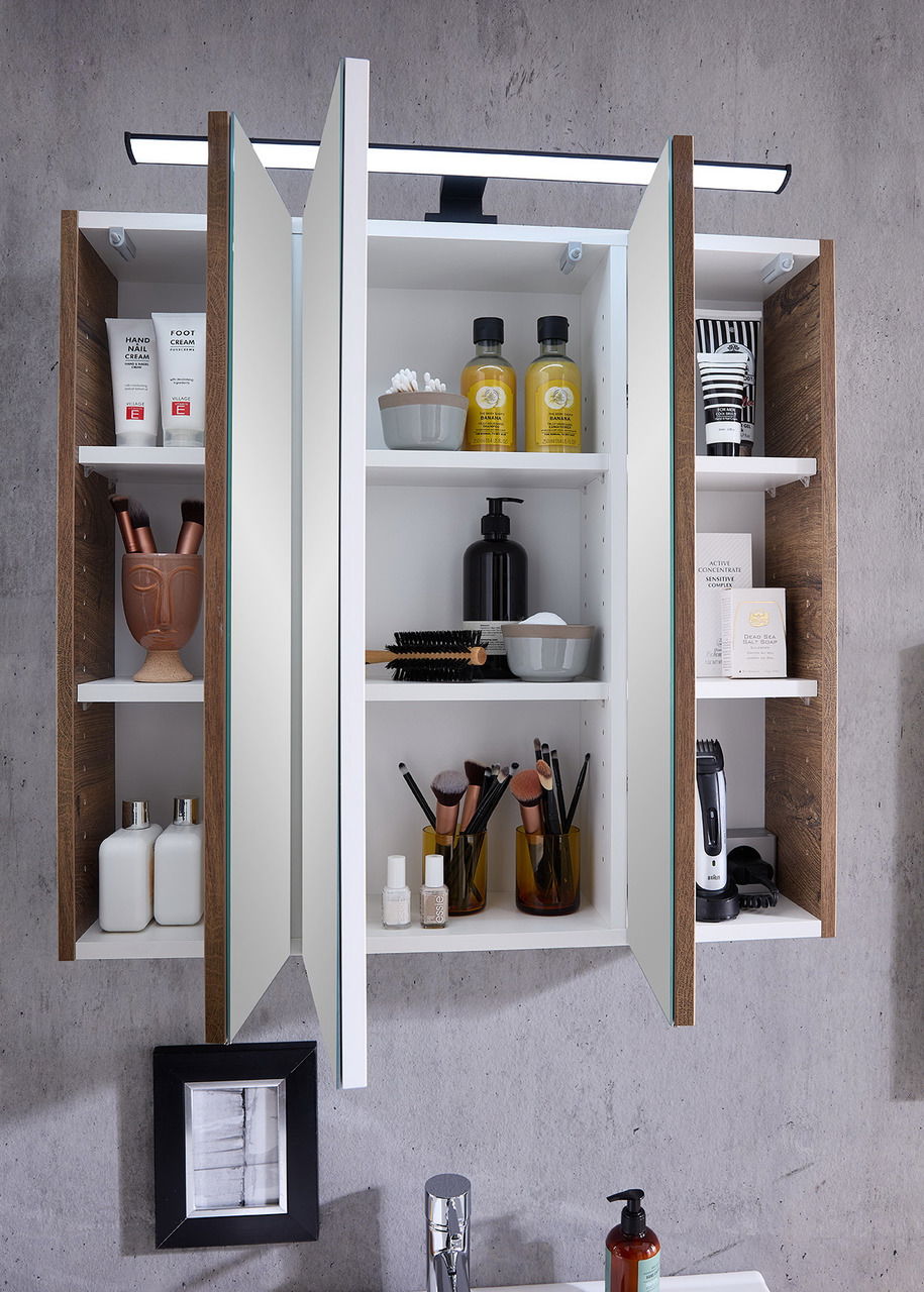 Spiegelschrank mit BeleuchtungB/H/T ca. 75 x 70 x 20 cm groß und stabile 22,6 kg schwer bietet der Schrank aus Holznachbildung drei einfach verspiegelte Drehtüren mit Türdämpfung. Dahinter liegen 6 Fachböden für alle Badutensilien. Eine LED-Aufsatzleuchte mit 12 W Nennleistung und 230 V Anschlussspannung sorgt für das passende Licht, das per Schalter ein- und ausgeschaltet werden kann. Eine Steckdose bietet weiteren Komfort. Kaufen Sie jetzt den Xora Spiegelschrank 374!