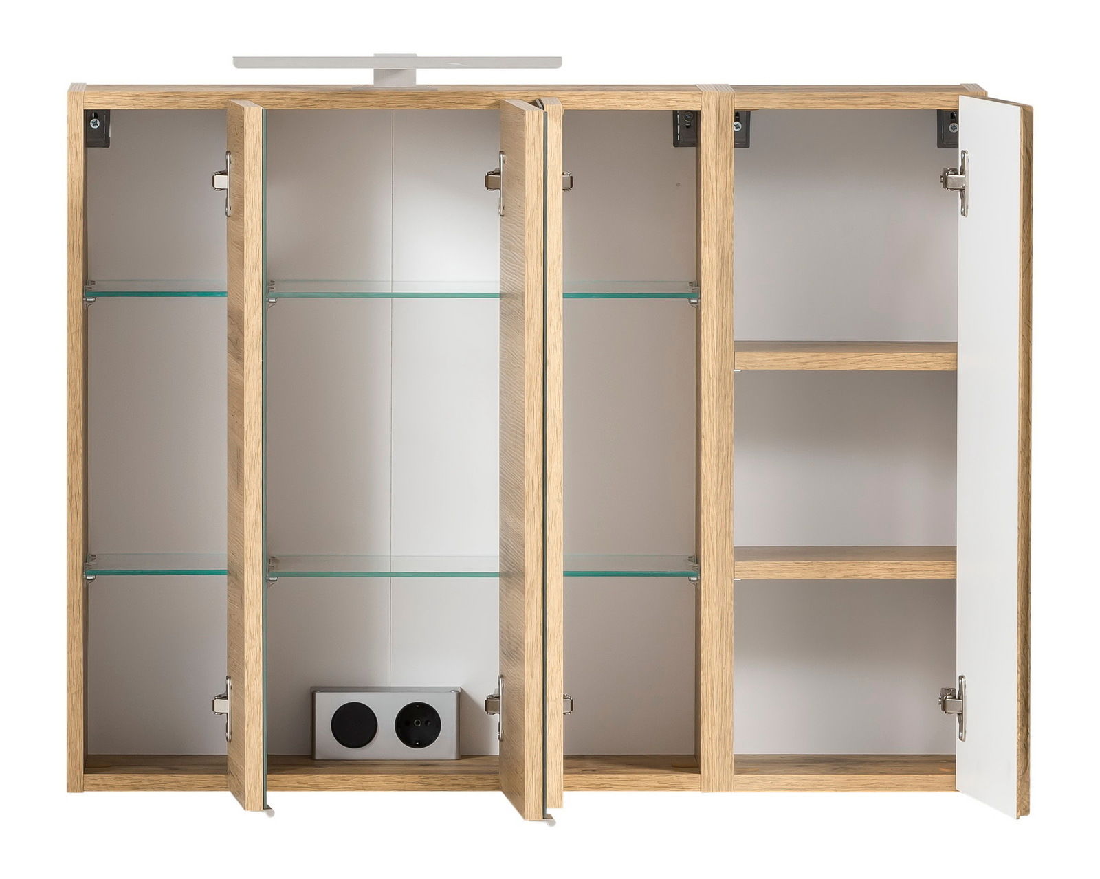 Der Spiegelschrank verfügt über eine LED-Aufbauleuchte in Edelstahloptik, die mit 6 Watt eine Leuchtstärke von 380 Lumen erzielt. Zudem ist eine Steckdose integriert, die das Anschließen von Elektrogeräten erleichtert. Genießen Sie die hochwertige Verarbeitung Made in Germany und die komfortable Ausstattung dieses Spiegelschranks. Bestellen Sie jetzt und werten Sie Ihr Badezimmer mit dem stilvollen XORA Spiegelschrank VARESE auf!