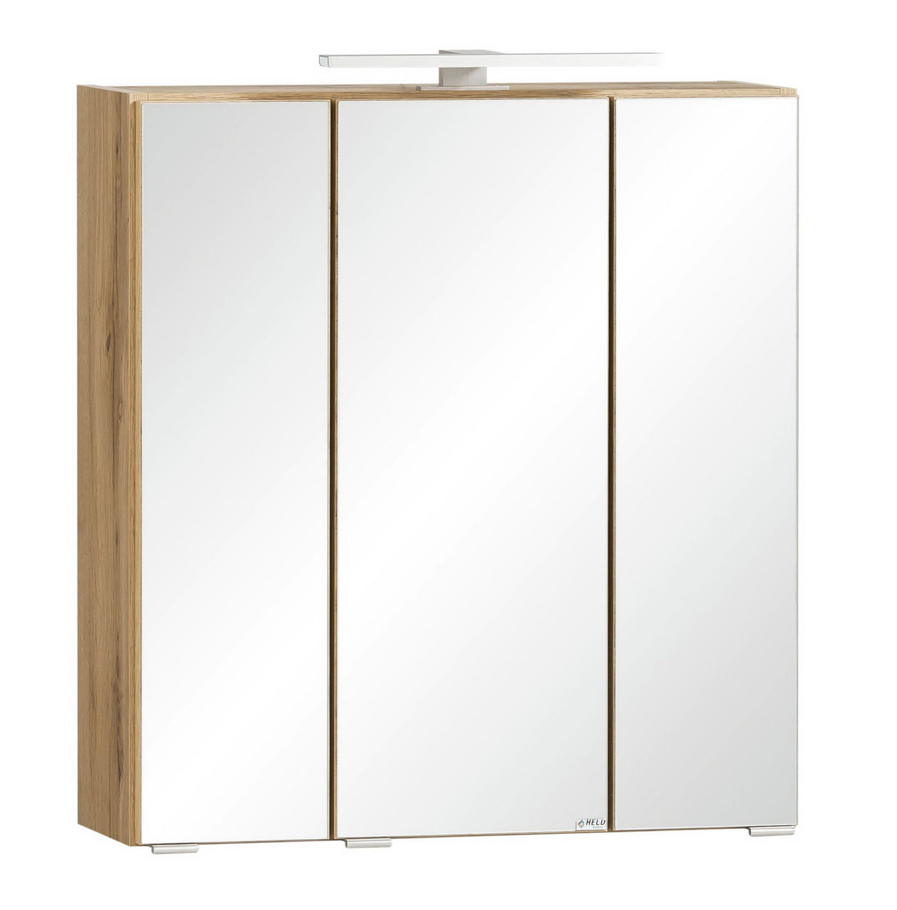 Der XORA Spiegelschrank VARESE besticht durch sein modernes und trendiges Design. In elegantem Eiche Wotan gehalten, fügt er sich nahtlos in jedes Badezimmer ein und setzt stilvolle Akzente. Aus hochwertiger Holznachbildung gefertigt, überzeugt der Schrank nicht nur optisch, sondern auch durch seine robuste Verarbeitung. Die drei Drehtüren bieten ausreichend Stauraum für alle Ihre Badutensilien. Dank der integrierten LED-Beleuchtung mit einer Nennleistung von 6 W und einer Farbtemperatur von 4000 K haben Sie stets eine perfekte Ausleuchtung – ideal für Ihre täglichen Pflege- und Schönheitsrituale.