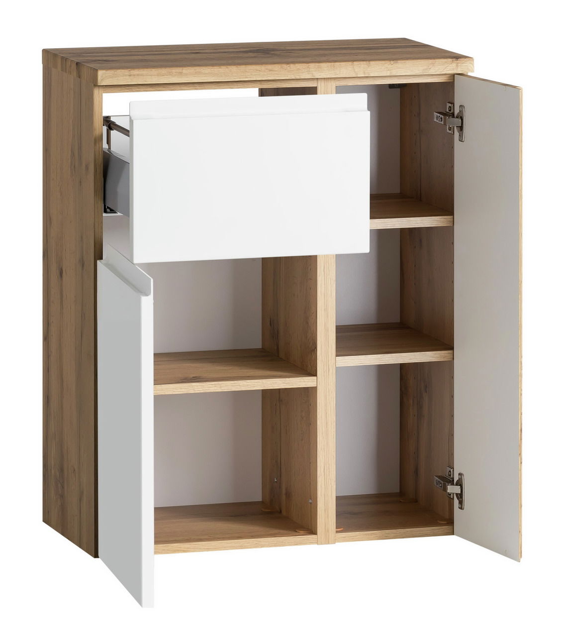 Der XORA Unterschrank VARESE vereint modernes Design und hohe Funktionalität in einem stilvollen Möbelstück. Mit seiner eleganten Farbkombination aus einer weissen Front und einem Korpus in Eiche Wotan bringt dieser Unterschrank zeitgemässe Ästhetik in Ihre Wohnung. Die grifflosen Drehtüren und die Schublade sorgen für ein minimalistisches Erscheinungsbild, während die Softclose-Technologie ein leises und sanftes Schliessen der Türen ermöglicht. Der Unterschrank ist aus hochwertiger Holznachbildung gefertigt und kann sowohl hängend als auch stehend montiert werden, wodurch er sich flexibel in verschiedene Räume integrieren lässt.