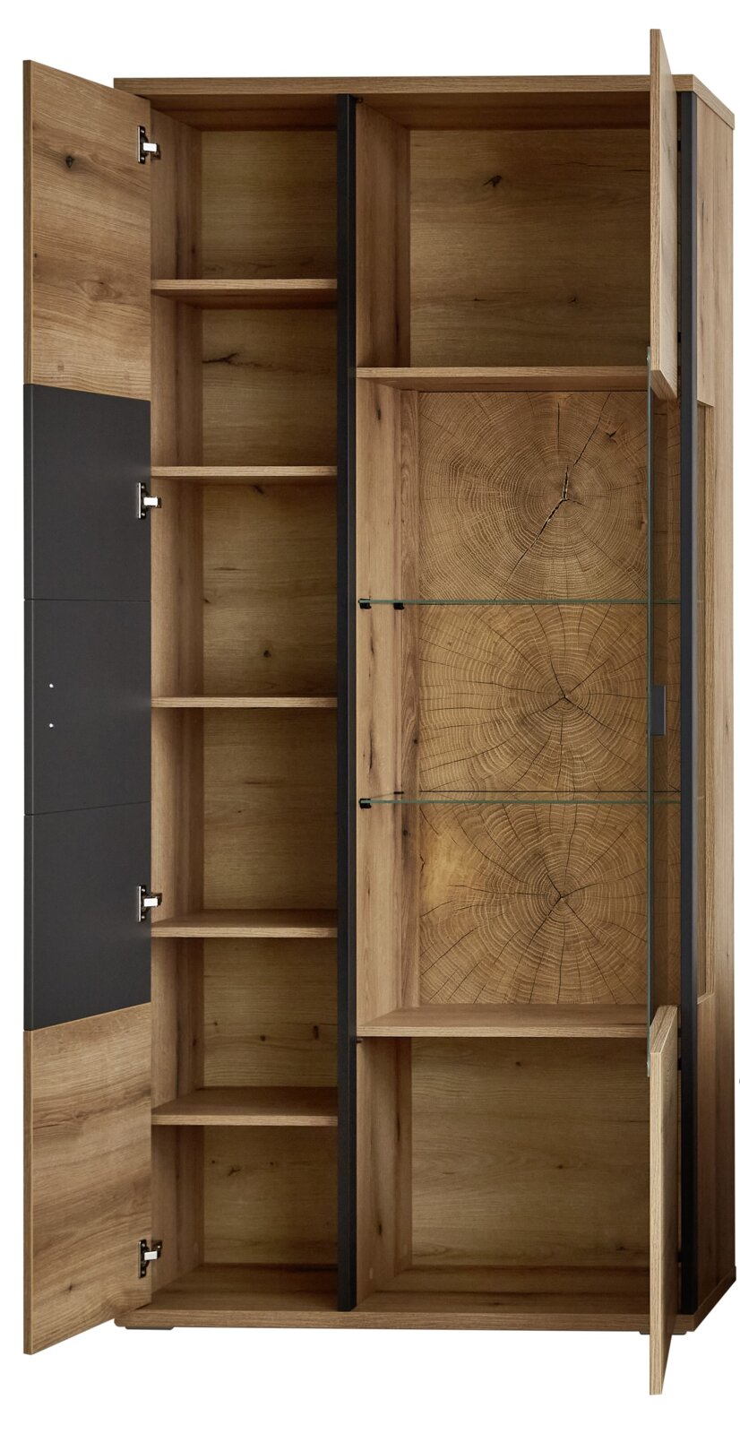 XORA Vitrine MELO - Eleganz trifft Funktionalität Die XORA Vitrine MELO überzeugt nicht nur durch ihr stilvolles Design, sondern auch durch ihre durchdachte Funktionalität. Der robuste Korpus aus hochwertiger Holznachbildung in Eiche-Optik harmoniert perfekt mit den schwarzen Metallgriffen und dem Rahmen, was den natürlichen Look der Vitrine unterstreicht. Die edle Kombination aus Glas und Holzimitat schafft eine elegante, moderne Atmosphäre in Ihrem Zuhause. Nutzen Sie die Vitrine, um Ihre wertvollsten Sammlerstücke oder Dekorationen stilvoll zu präsentieren. Entdecken Sie jetzt die perfekte Ergänzung für Ihr Wohnambiente!