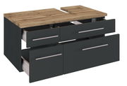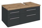 Erleben Sie das moderne Design des XORA Waschbeckenunterschrankes rechts DAVOS. Die stilvolle Kombination aus grauer Front und graphitfarbenem Korpus verleiht Ihrem Badezimmer eine trendige und elegante Atmosphäre. Mit seinem zeitgemässen Look und dem hochwertigen Holznachbildungs-Material passt dieser Unterschrank perfekt in jedes moderne Badezimmer. Ausgestattet mit vier geräumigen Schubladen und praktischen Griffen, bietet er ausreichend Stauraum für all Ihre Badutensilien. Dank der Softclose-Funktion schliessen die Schubladen leise und sanft. Der hängende Aufbau erleichtert die Reinigung des Bodens und verleiht dem Raum ein luftiges Ambiente.