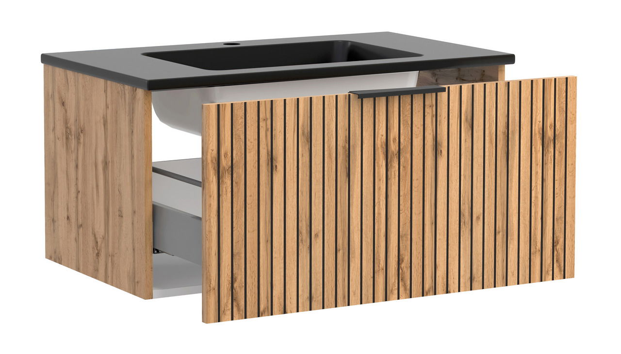Das XORA Waschtisch-Set LIVERPOOL kombiniert modernes Design mit praktischer Funktionalität, perfekt für jedes Badezimmer. Mit einer Front und einem Korpus in Eiche Wotan Holznachbildung, bietet dieses Set eine ansprechende Optik, die Ihren Raum aufwertet. Die Masse mit einer Höhe von 41 cm, einer Tiefe von 47 cm und einer Breite von 80 cm sind ideal, um auch in kleineren Badezimmern einen stilvollen Akzent zu setzen. Dieses Set ist mit einer Schublade ausgestattet, die über ein Softclose-System verfügt, sodass sie sich sanft und leise schliessen lässt. Die hängende Montage spart Platz und erleichtert die Reinigung des Bodens unter dem Waschtisch.