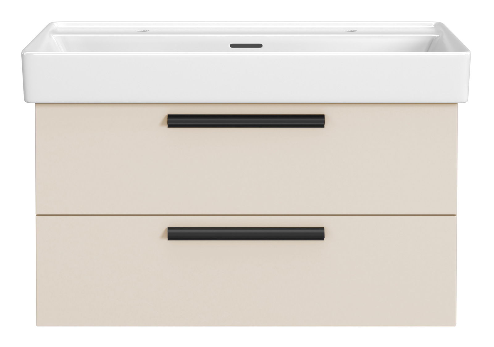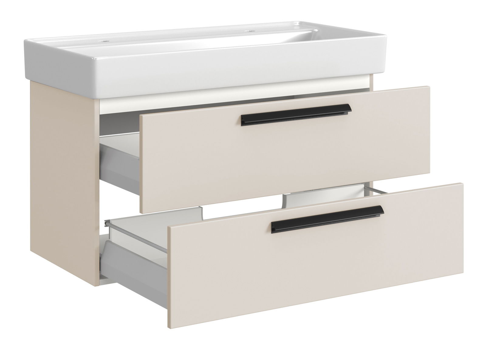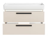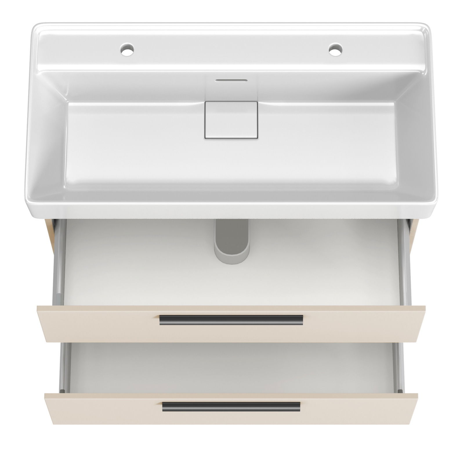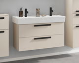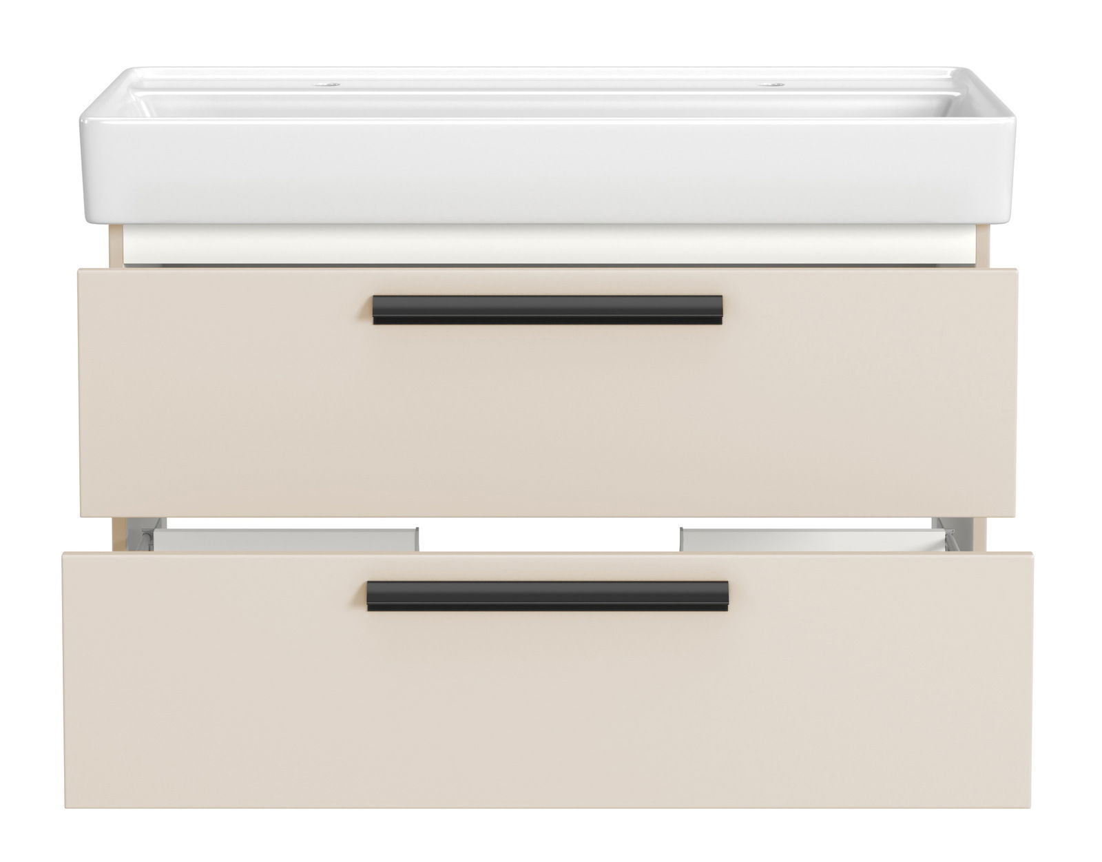 Erleben Sie mit dem XORA Waschtisch-Set für 2 Armaturen VANNES ein modernes Designhighlight für Ihr Badezimmer. Der elegante Stil in der Farbe Sand verleiht Ihrem Raum eine ruhige und zeitgemäße Atmosphäre. Der Korpus und die Front in harmonischem Sandton schaffen ein stimmiges Gesamtbild. Gefertigt aus hochwertiger Holznachbildung, verbindet dieses Set Ästhetik und Funktionalität auf perfekte Weise. Die zwei Schubladen bieten ausreichend Stauraum für Ihre Badezimmerutensilien und sind mit einem Softclose-Mechanismus ausgestattet, der für sanftes und geräuschloses Schließen sorgt. Dieses hängende Set bringt Leichtigkeit in Ihr Badezimmer.