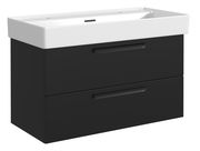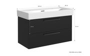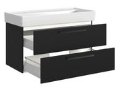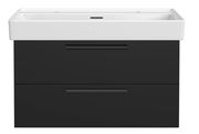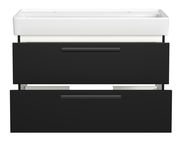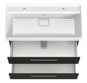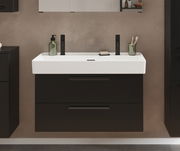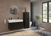 Erleben Sie modernes Design in Perfektion mit dem XORA Waschtisch-Set für 2 Armaturen VANNES. Dieses stilvolle Set besticht durch seine zeitgemäße Ästhetik in elegantem Schwarz. Sowohl die Front als auch der Korpus sind in edlem Schwarz gehalten, was das Set zu einem echten Highlight in Ihrem Badezimmer macht. Die hängende Aufstellmöglichkeit verleiht dem Raum eine luftige Atmosphäre und spart wertvollen Platz. Die beiden integrierten Schubladen bieten ausreichend Stauraum und sind mit einem praktischen Softclose-Mechanismus ausgestattet, der ein sanftes und leises Schließen garantiert. Das Hauptmaterial aus Holznachbildung sorgt für eine pflegeleichte und langlebige Oberfläche.