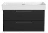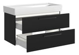 Erleben Sie mit dem XORA Waschtisch-Set VANNES die perfekte Kombination aus modernem Design und praktischer Funktionalität. Dieses stilvolle Set präsentiert sich in eleganter schwarzer Farbe, die sowohl die Front als auch den Korpus umfasst, und fügt sich nahtlos in jedes zeitgemäße Badezimmerambiente ein. Die Holznachbildung als Hauptmaterial verleiht dem Waschtisch-Set eine ansprechende Optik und langlebige Qualität. Ausgestattet mit zwei geräumigen Schubladen, bietet es ausreichend Stauraum für all Ihre Badutensilien. Dank der Softclose-Funktion schließen die Schubladen sanft und leise. Die hängende Aufstellmöglichkeit sorgt zudem für eine moderne und platzsparende Installation.