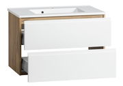 Das XORA Waschtisch-Set VARESE verbindet modernes Design mit funktionaler Eleganz. Mit einer Breite von 80 cm bietet es ausreichend Platz für Ihre täglichen Pflegeutensilien. Die Front in strahlendem Weiss harmoniert perfekt mit dem Korpus in Eiche Wotan und verleiht Ihrem Badezimmer einen trendigen und stilvollen Look. Der grifflos gestaltete Waschtisch sorgt für eine cleane Optik, während die Softclose-Funktion der beiden Schubladen sanftes und leises Schliessen garantiert. Gefertigt aus hochwertiger Holznachbildung, ist dieses Set nicht nur optisch ansprechend, sondern auch langlebig und pflegeleicht.