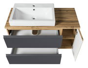Das XORA Waschtisch-Set VARESE ist die perfekte Wahl für moderne Badezimmer. Mit seinem trendigen Design und den eleganten Farben, Grau für die Front und Eiche Wotan für den Korpus, bringt es Stil und Funktionalität in jedes Bad. Der hängende Waschtisch mit griffloser Optik und einer Tür ist nicht nur ein optisches Highlight, sondern auch äusserst praktisch. Dank der Softclose-Funktion schliessen die zwei Schubladen sanft und leise. Gefertigt aus hochwertiger Holznachbildung, bietet dieses Set Langlebigkeit und einfache Pflege. Verwandeln Sie Ihr Badezimmer in eine wahre Wohlfühloase.