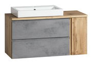 Das XORA Waschtisch-Set VARESE kombiniert modernes Design mit funktionaler Eleganz. Die Front in Betonoptik und der Korpus in Eiche Wotan schaffen einen stilvollen Kontrast, der in jedem Badezimmer beeindruckend zur Geltung kommt. Dank der grifflosen Gestaltung fügt sich das Set nahtlos in moderne Einrichtungsstile ein. Der Waschtisch verfügt über eine Tür und zwei Schubladen, die ausreichend Stauraum für Ihre Badeutensilien bieten. Das hängende Design sorgt nicht nur für eine schwebende Optik, sondern erleichtert auch die Reinigung des Bodens.